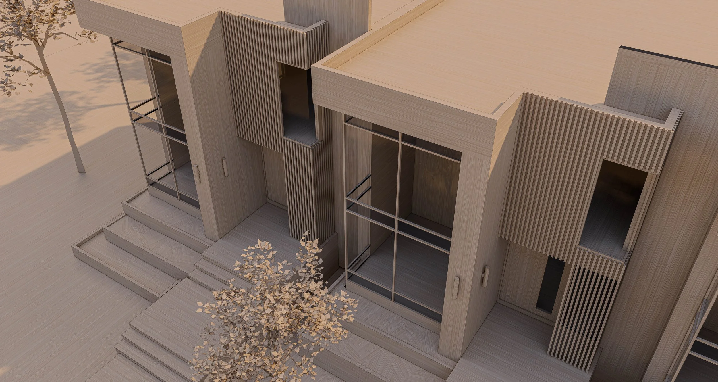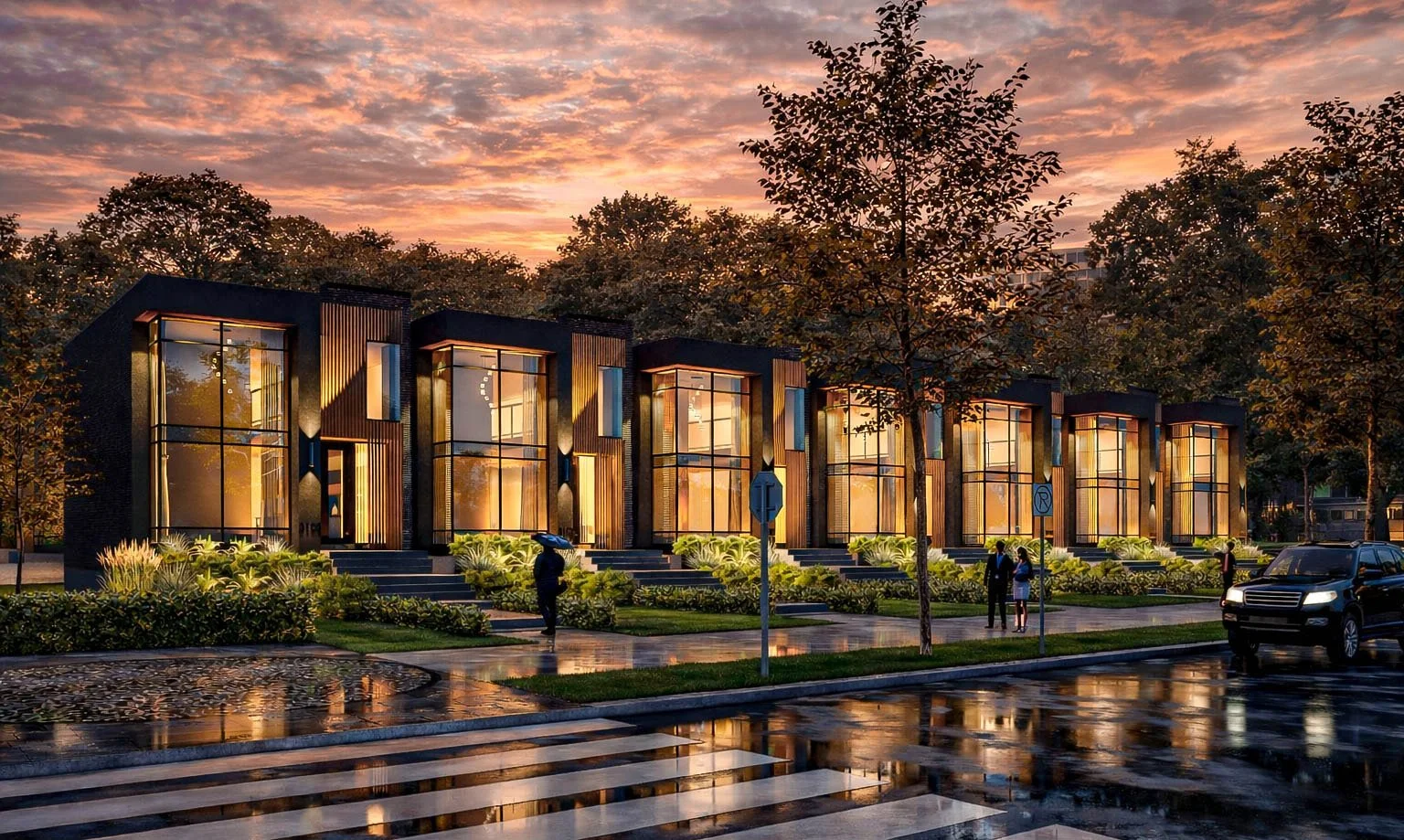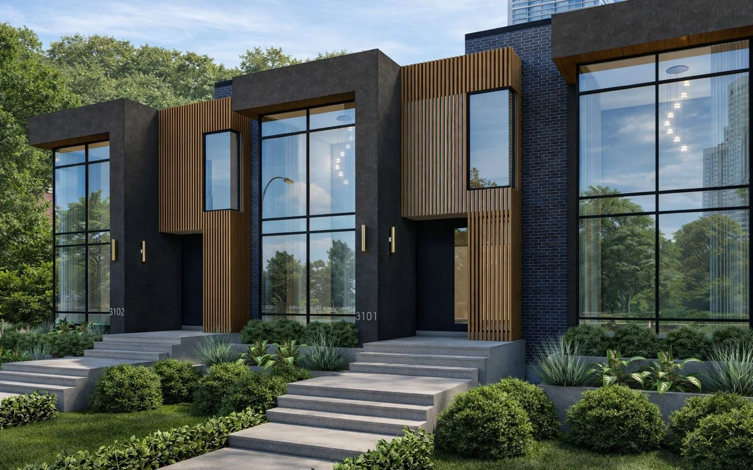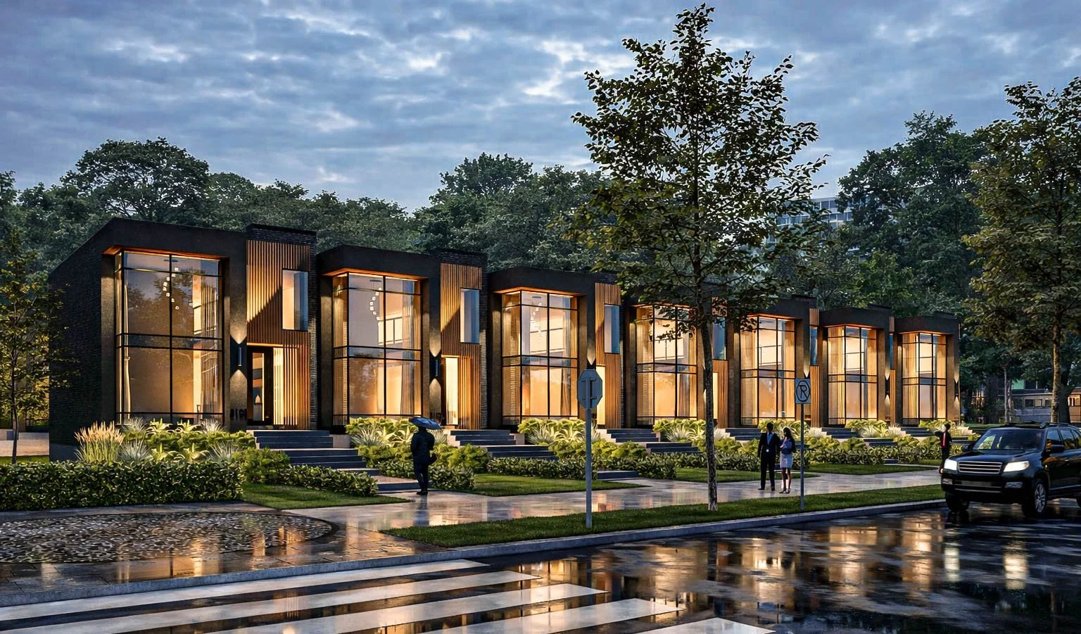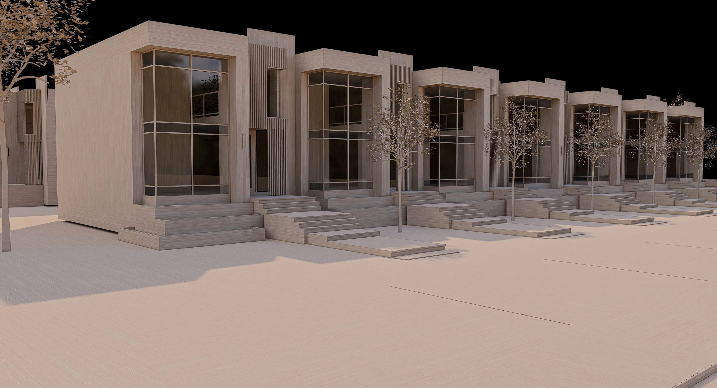 The composition balances solidity and transparency—dark masonry volumes softened by warm wood accents and luminous glazing. Elevated entries and articulated stoops reinforce pedestrian scale, while integrated landscaping grounds the contemporary forms within their setting.