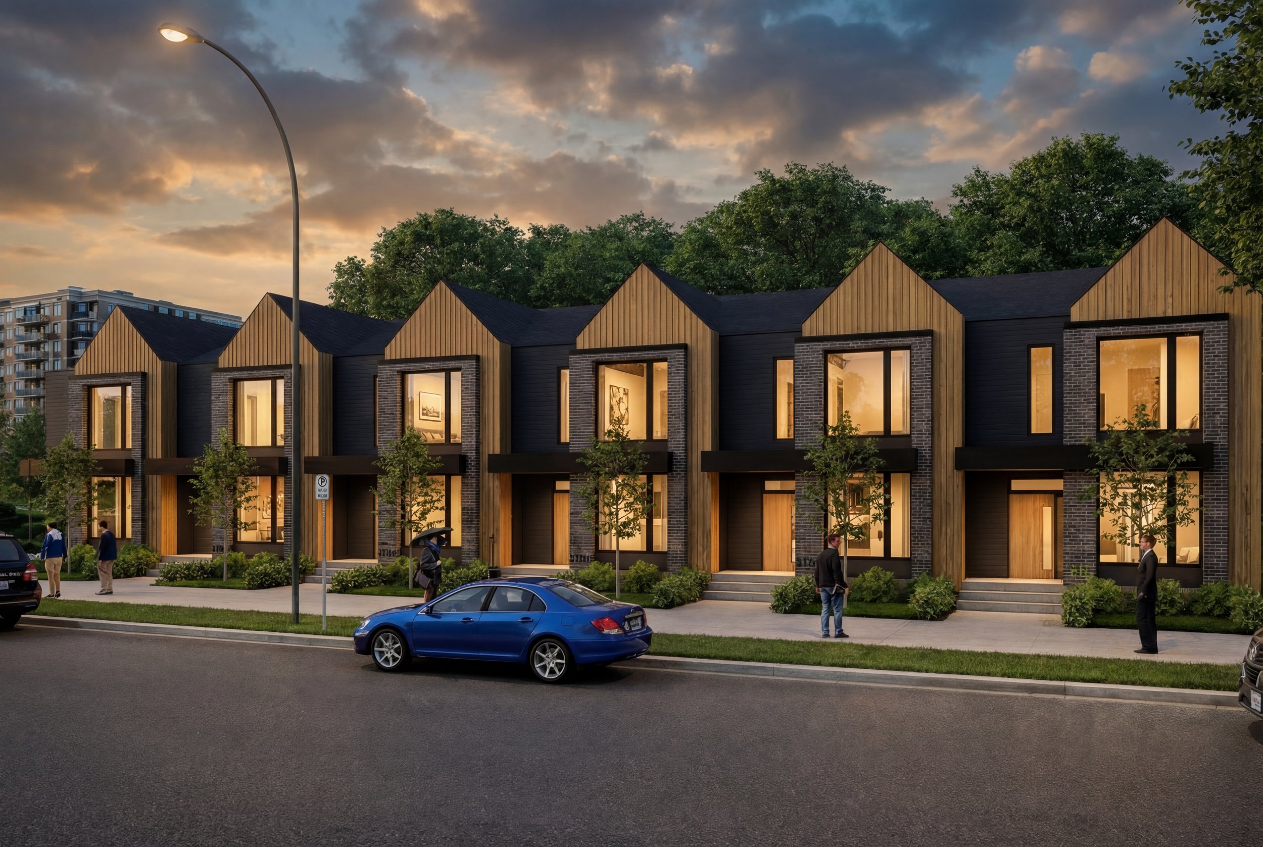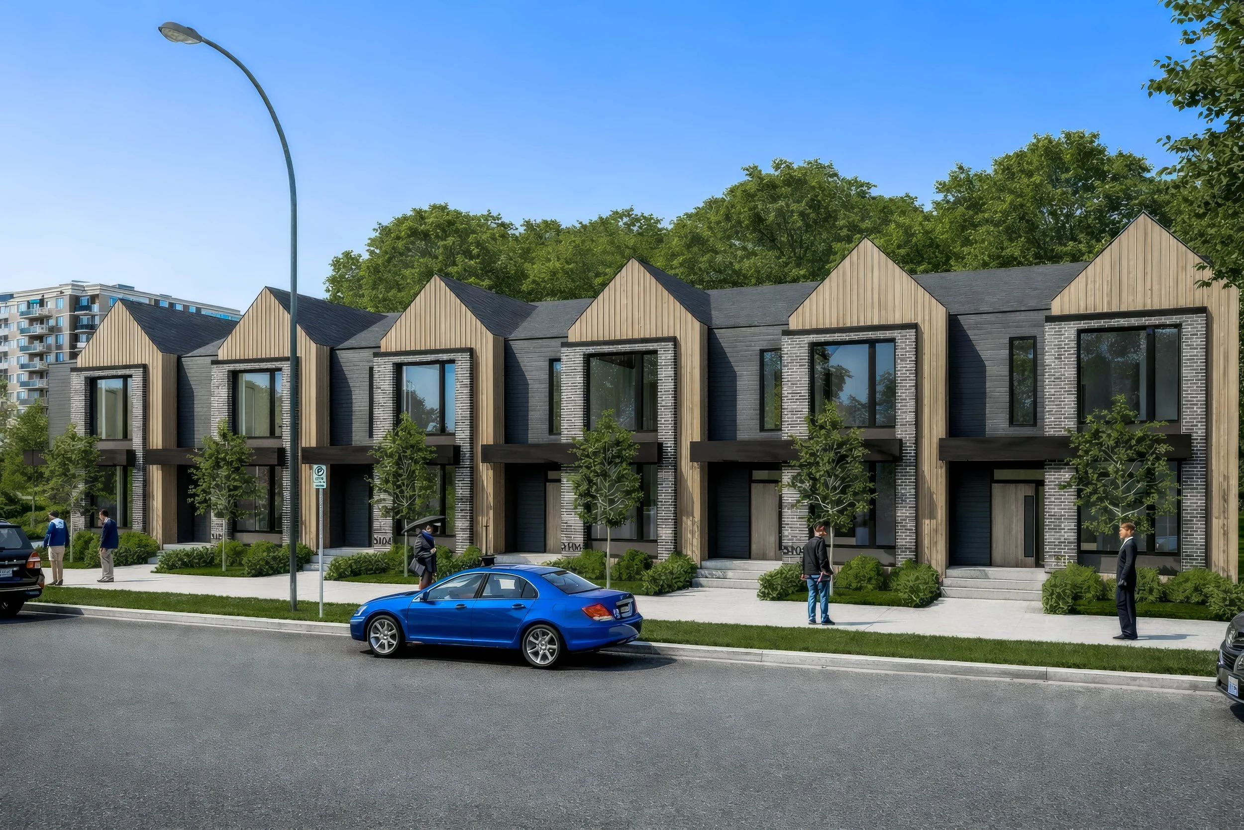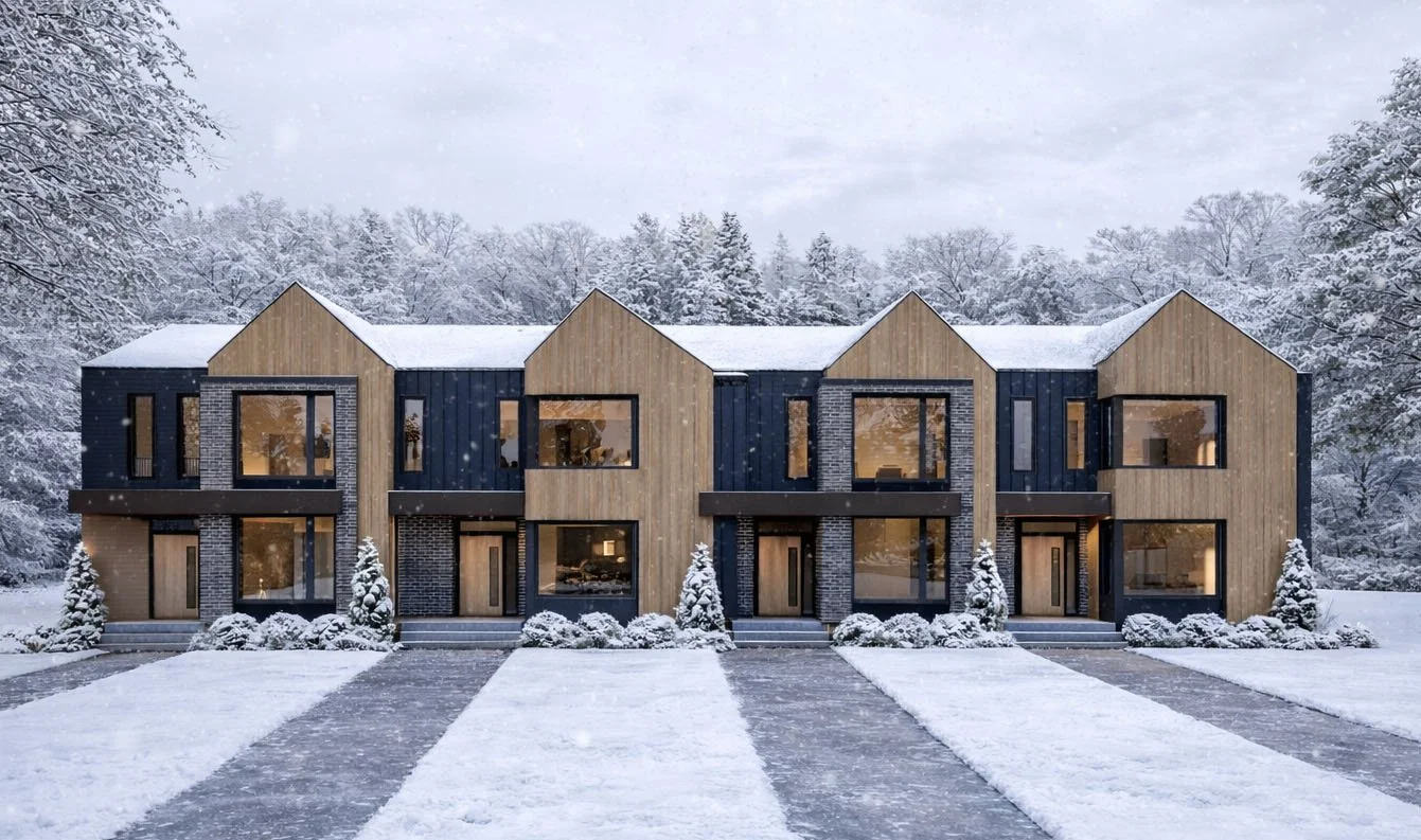 A cohesive row of gabled forms (single & dual) creates visual cadence, allowing the project to read at once as single-family residences, semi-detached homes, triplexes, or street townhouses. These units can be intermixed to generate varied elevation compositions while maintaining a unified identity.