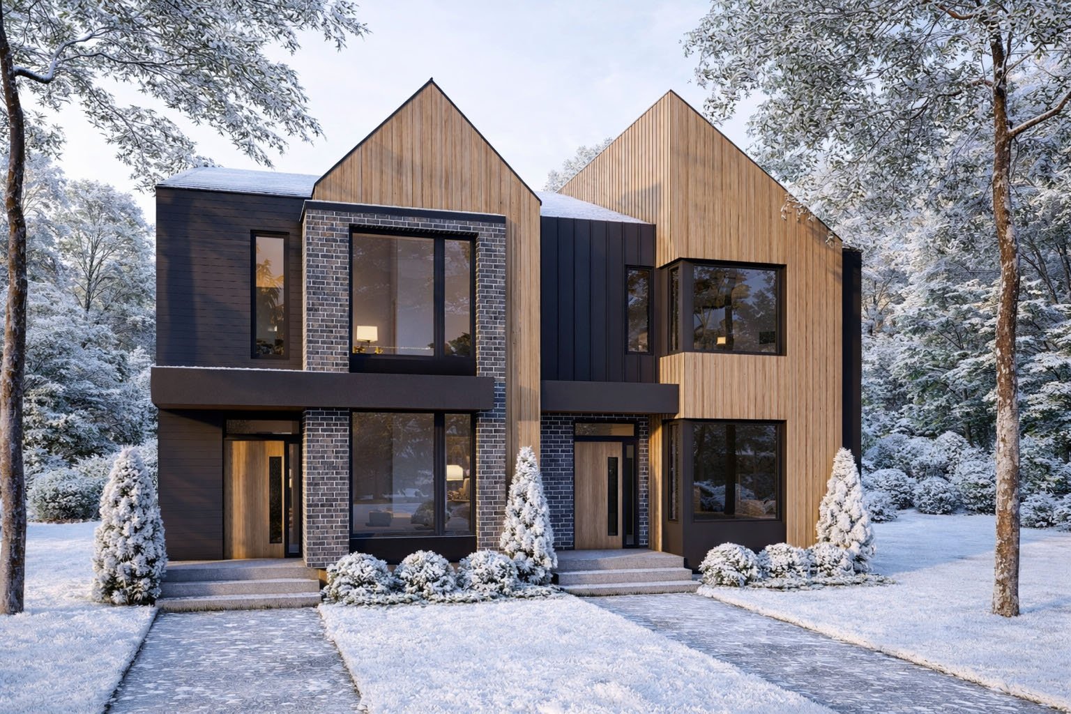 Vertical wood cladding defines the upper gables, while richly toned brick frames expansive black-trimmed windows, adding depth and contrast. The restrained palette—wood, brick, dark panels, and charcoal roofing—balances modern minimalism with warmth and durability.