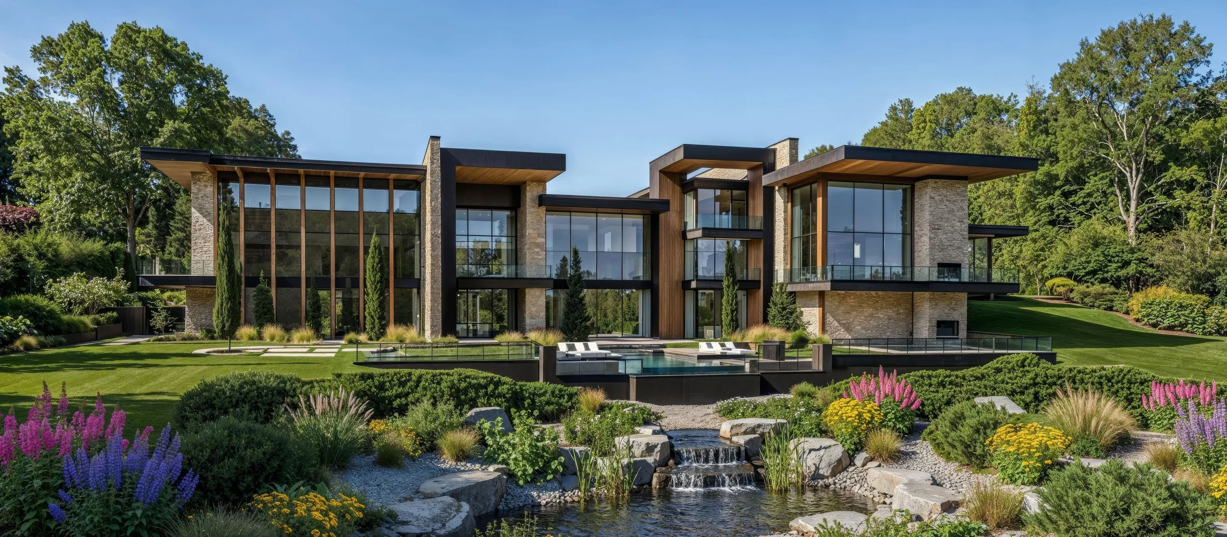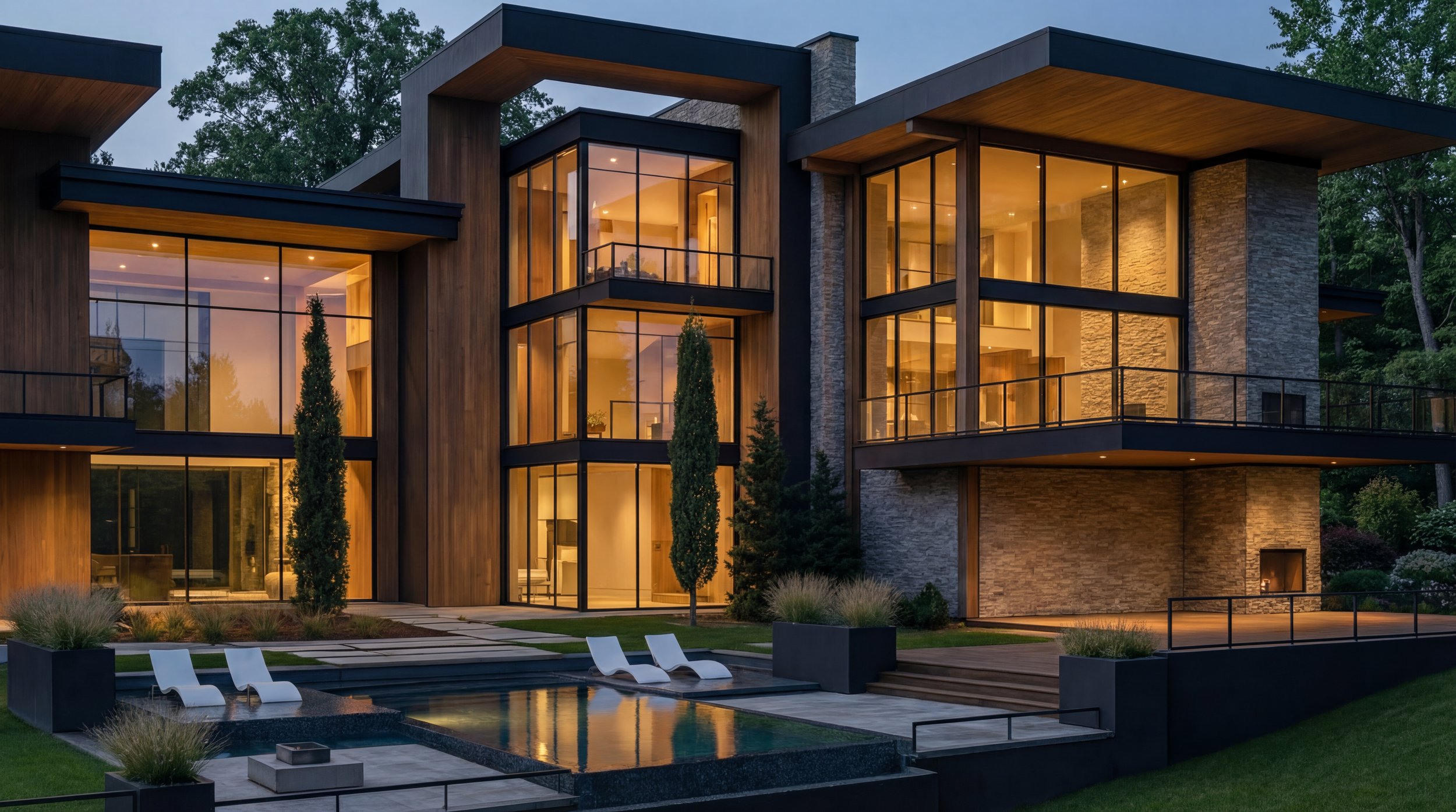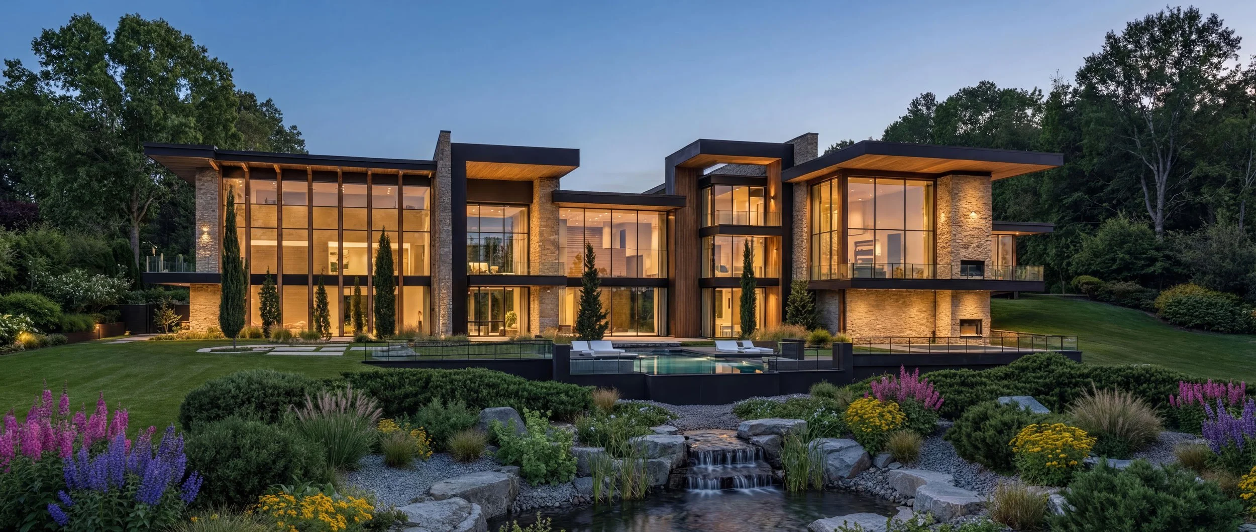 This residence is a refined composition of modern architecture and natural materiality, thoughtfully designed to sit in quiet harmony with its landscape. Strong horizontal rooflines extend outward with confidence, creating a sense of shelter and balance while visually anchoring the home to the terrain. Expansive planes of stone, warm wood accents, and dark metal detailing work together to establish a timeless yet contemporary presence—one that feels both grounded and elevated within its setting.
