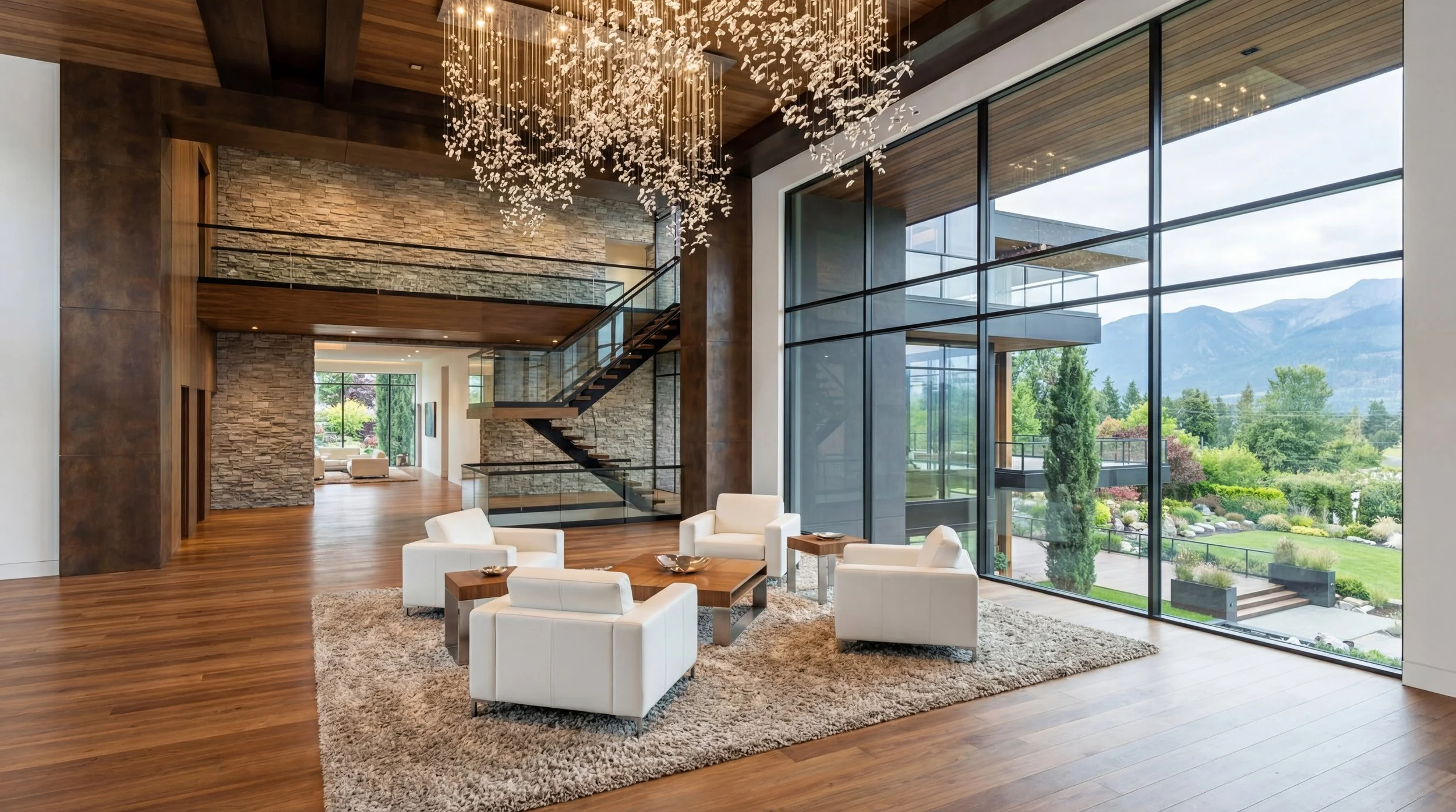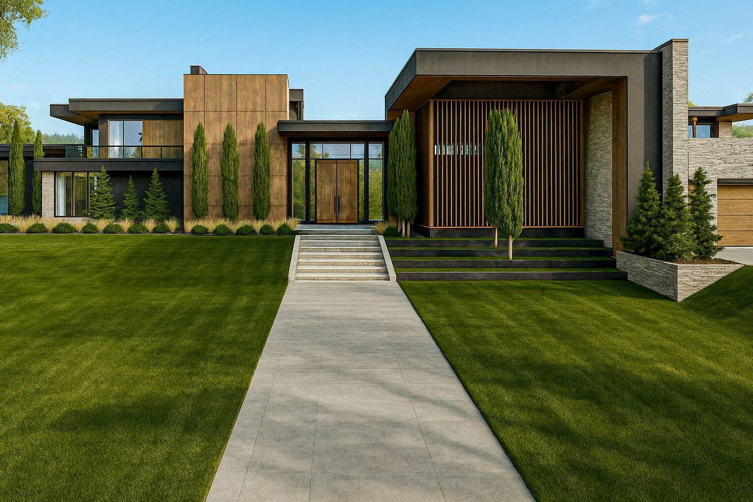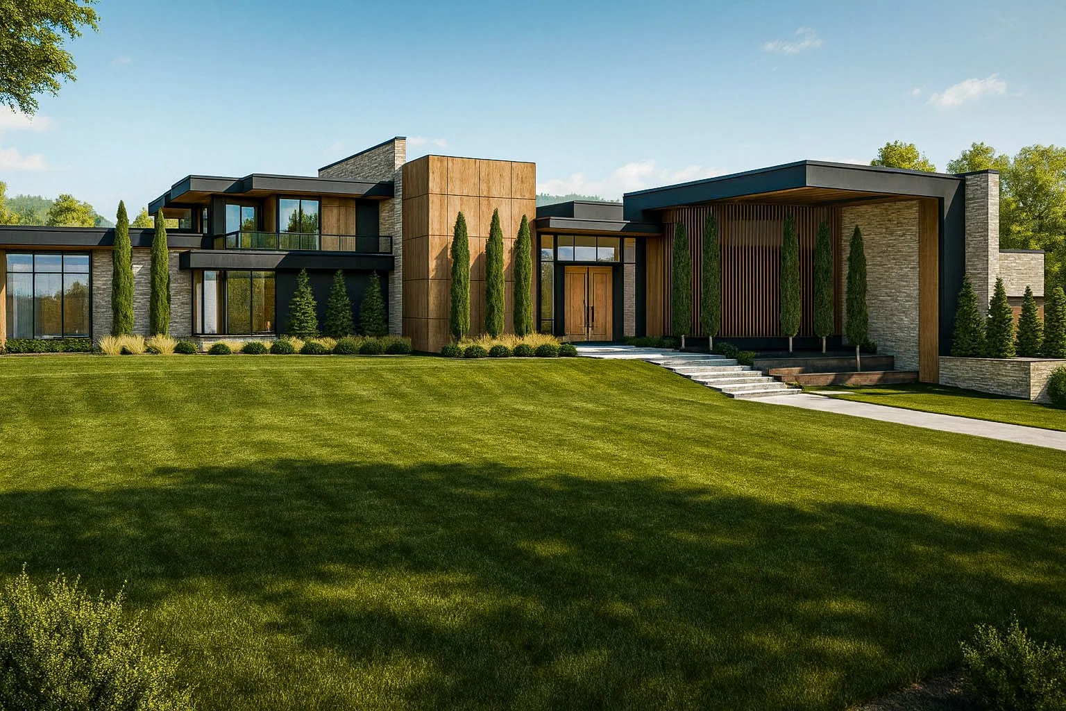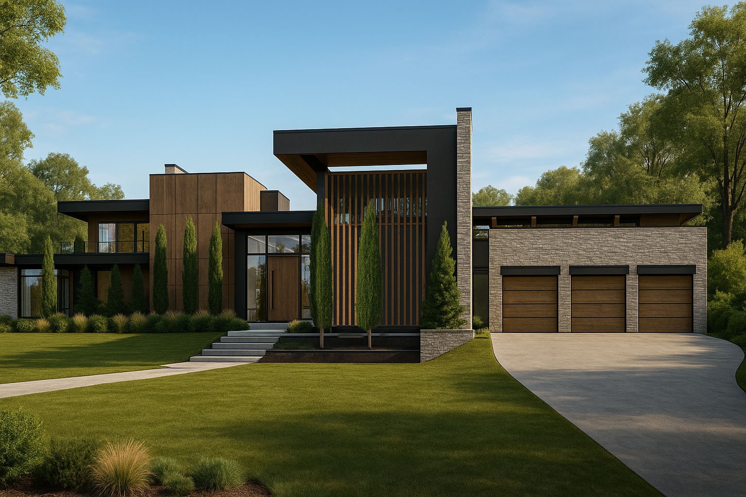 This residence is a refined composition of modern architecture and natural materiality, thoughtfully designed to sit in quiet harmony with its landscape. Strong horizontal rooflines extend outward with confidence, creating a sense of shelter and balance while visually anchoring the home to the terrain. Expansive planes of stone, warm wood accents, and dark metal detailing work together to establish a timeless yet contemporary presence—one that feels both grounded and elevated within its setting.