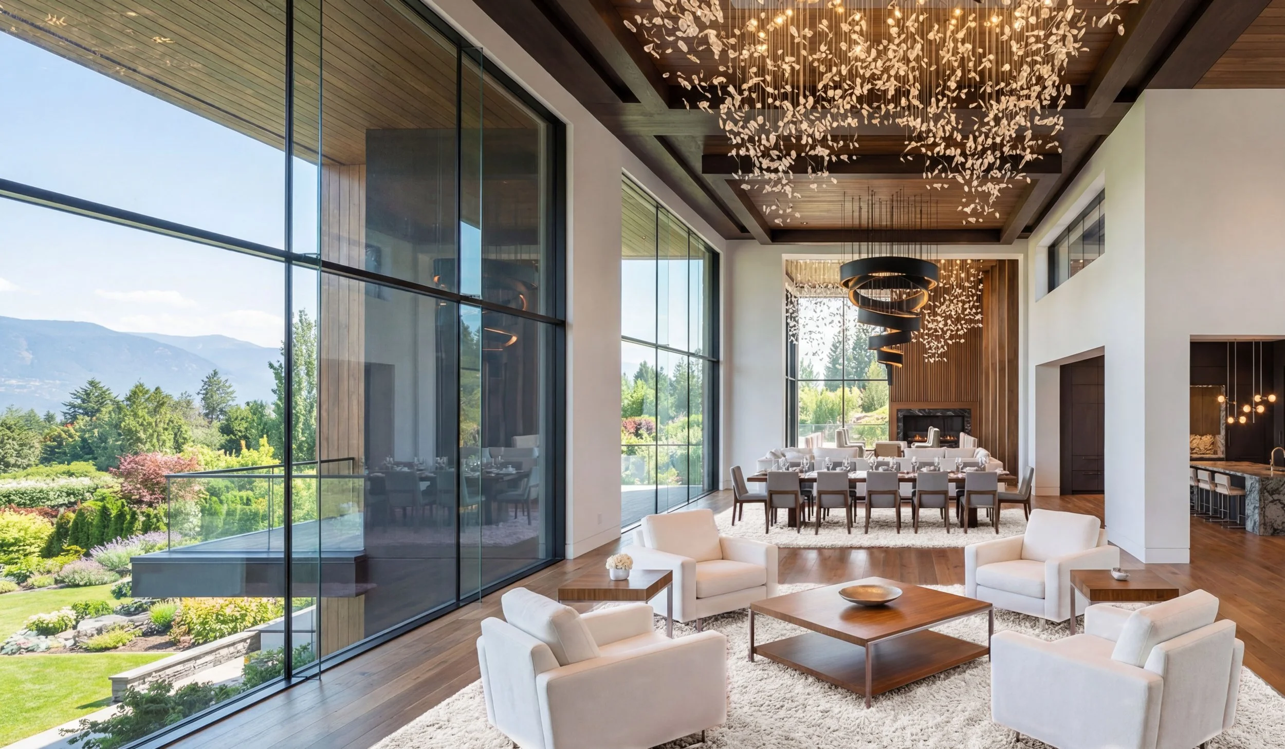 Floor-to-ceiling glazing defines much of the façade, dissolving the boundary between interior and exterior and allowing light, views, and landscape to become integral elements of daily living. The home’s massing is carefully articulated into distinct volumes, each offset and layered to create depth, rhythm, and visual interest. Cantilevered forms and recessed terraces provide moments of intimacy and openness, while transparent corners and glass balustrades maintain uninterrupted sightlines across the surrounding grounds.