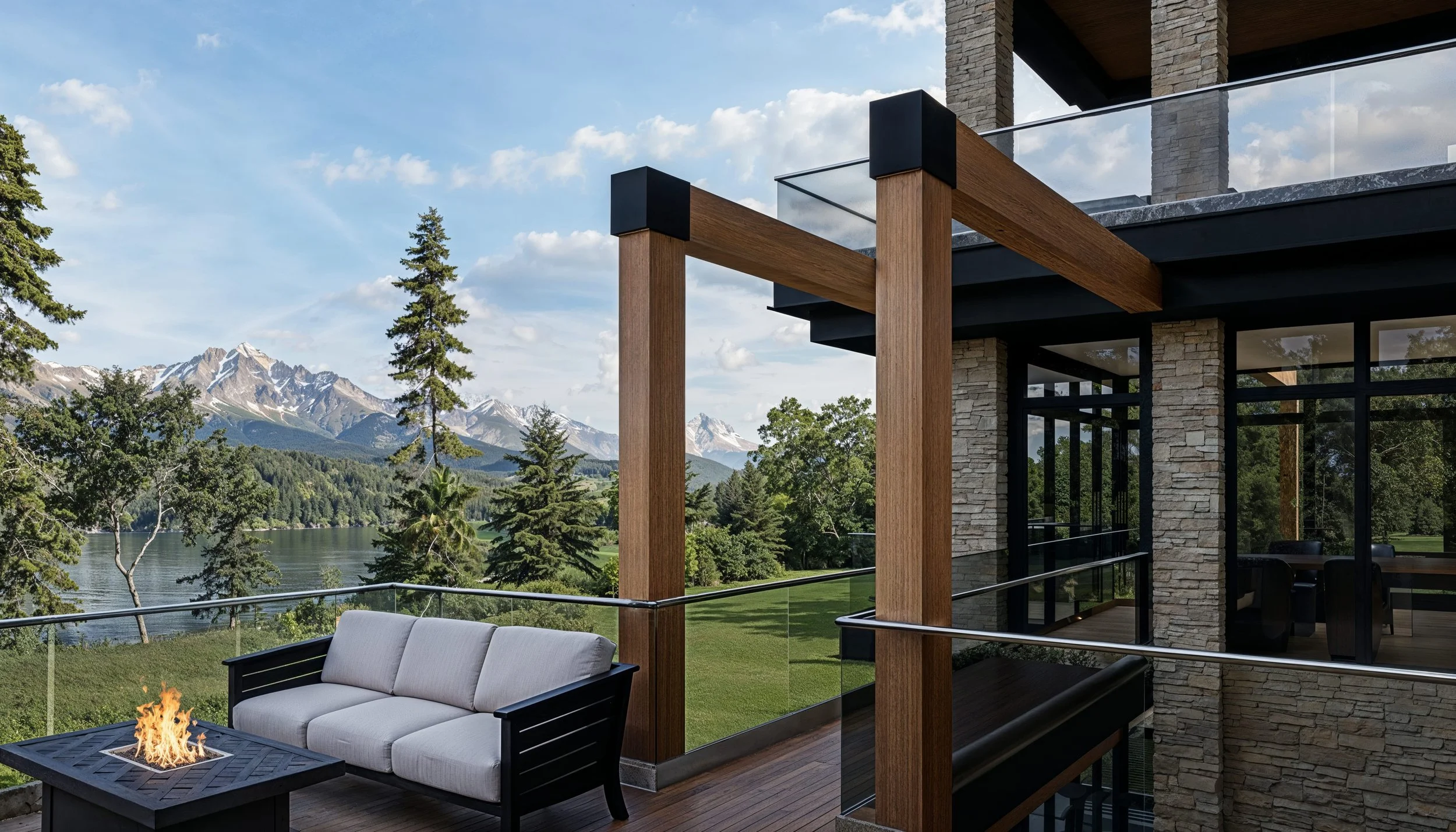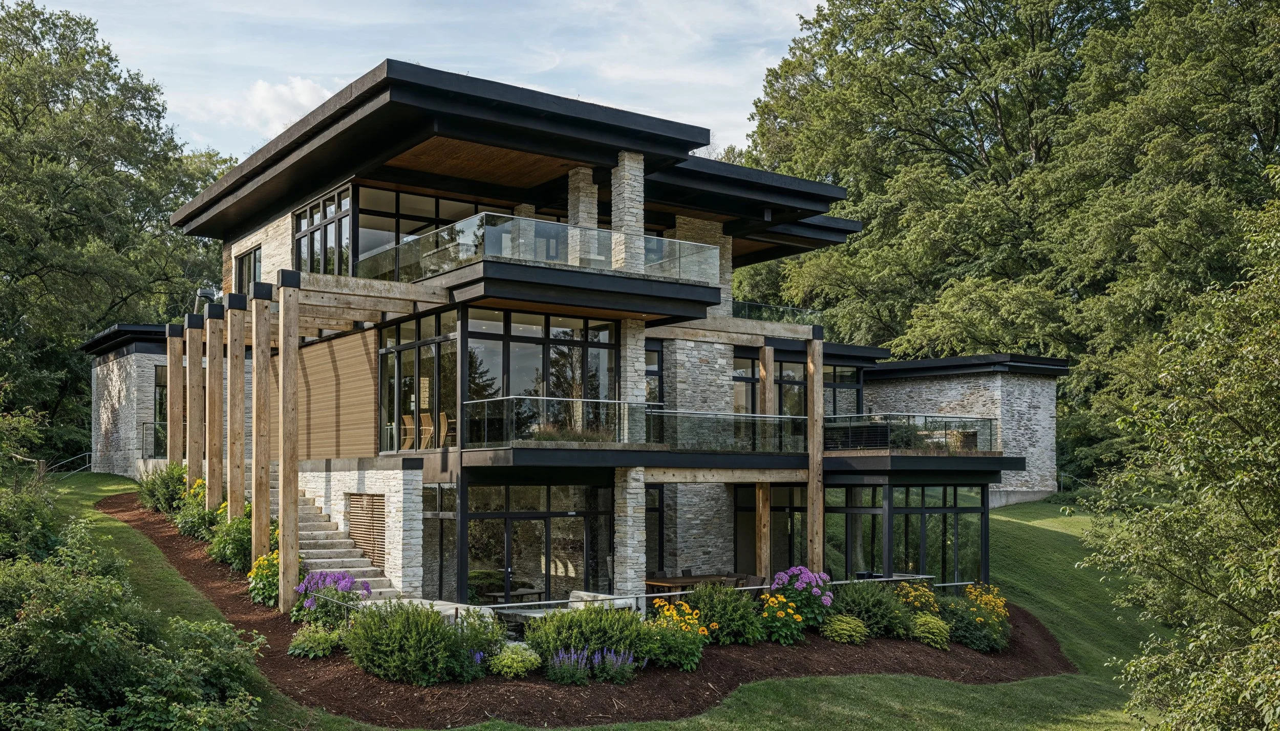 Perched gracefully along a gentle hillside, this contemporary residence is a refined composition of clean horizontal lines, natural stone, and expansive glass. Its layered flat rooflines extend outward in confident planes, creating deep overhangs that provide shelter while emphasizing the home’s strong architectural geometry.