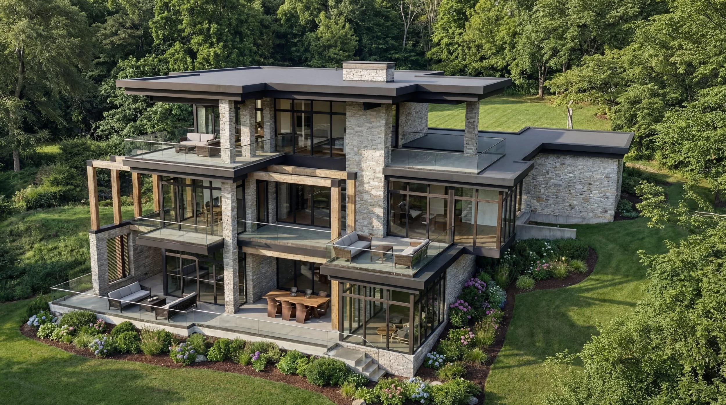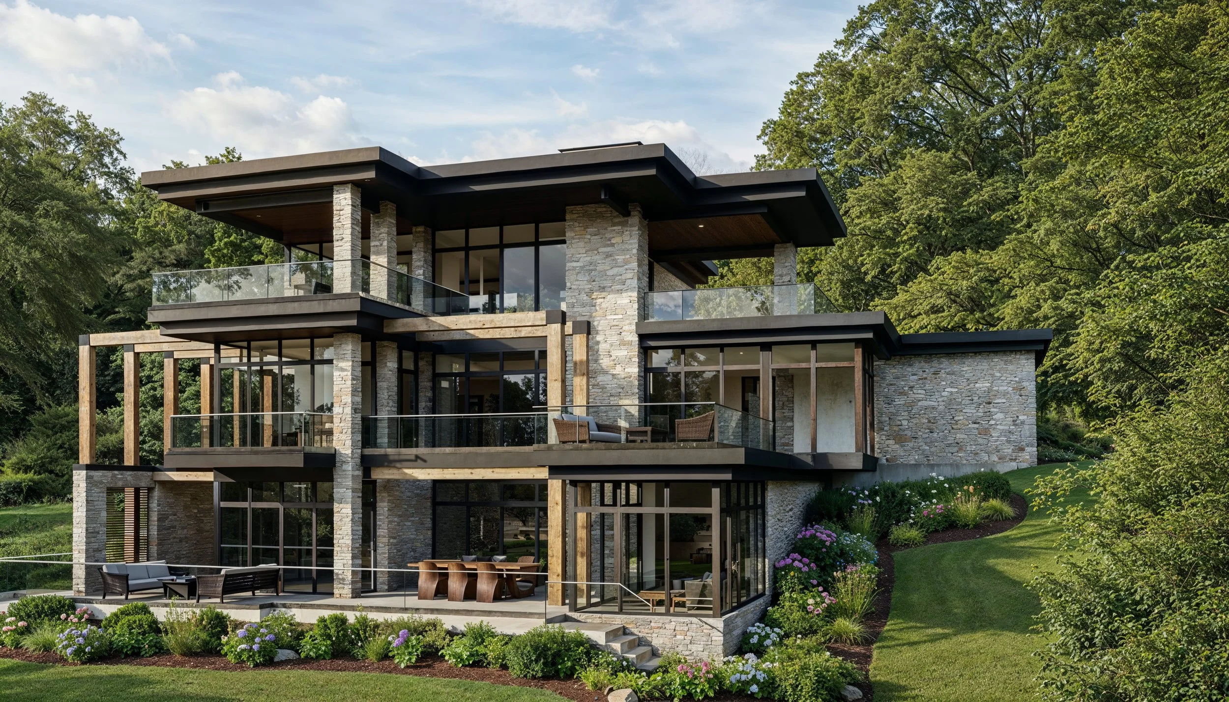 Stacked stone walls anchor the structure to the landscape, while warm wood accents soften the modern silhouette. Floor-to-ceiling windows wrap each level, inviting abundant natural light into the interior and framing serene views of the surrounding greenery. The design thoughtfully steps with the terrain, allowing each floor to open seamlessly onto generous terraces and outdoor living areas.