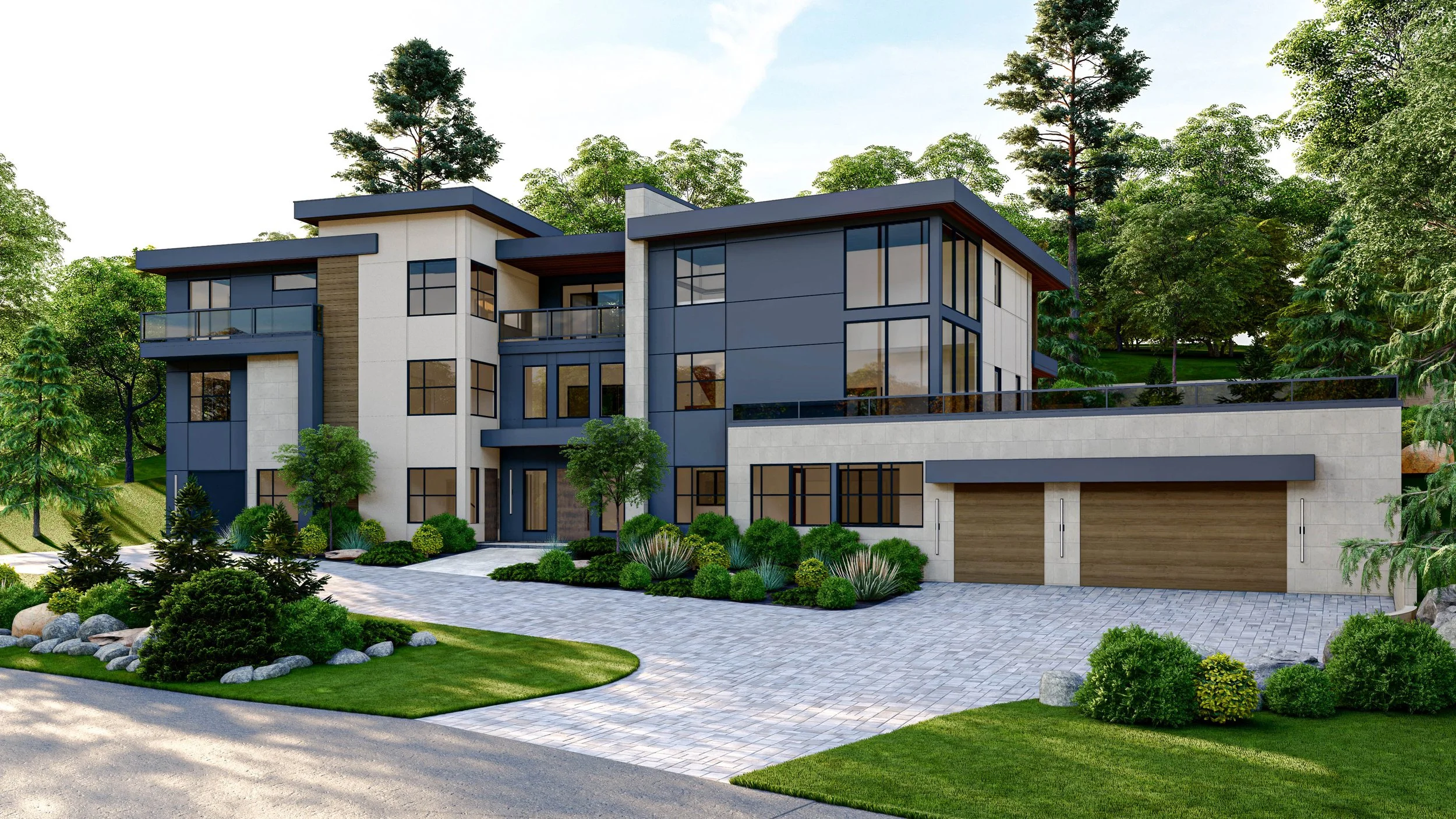 The exquisite and striking exterior facade of the Crestmont Residence embodies refined contemporary design, defined by clean lines, bold geometry, and a sophisticated material palette.