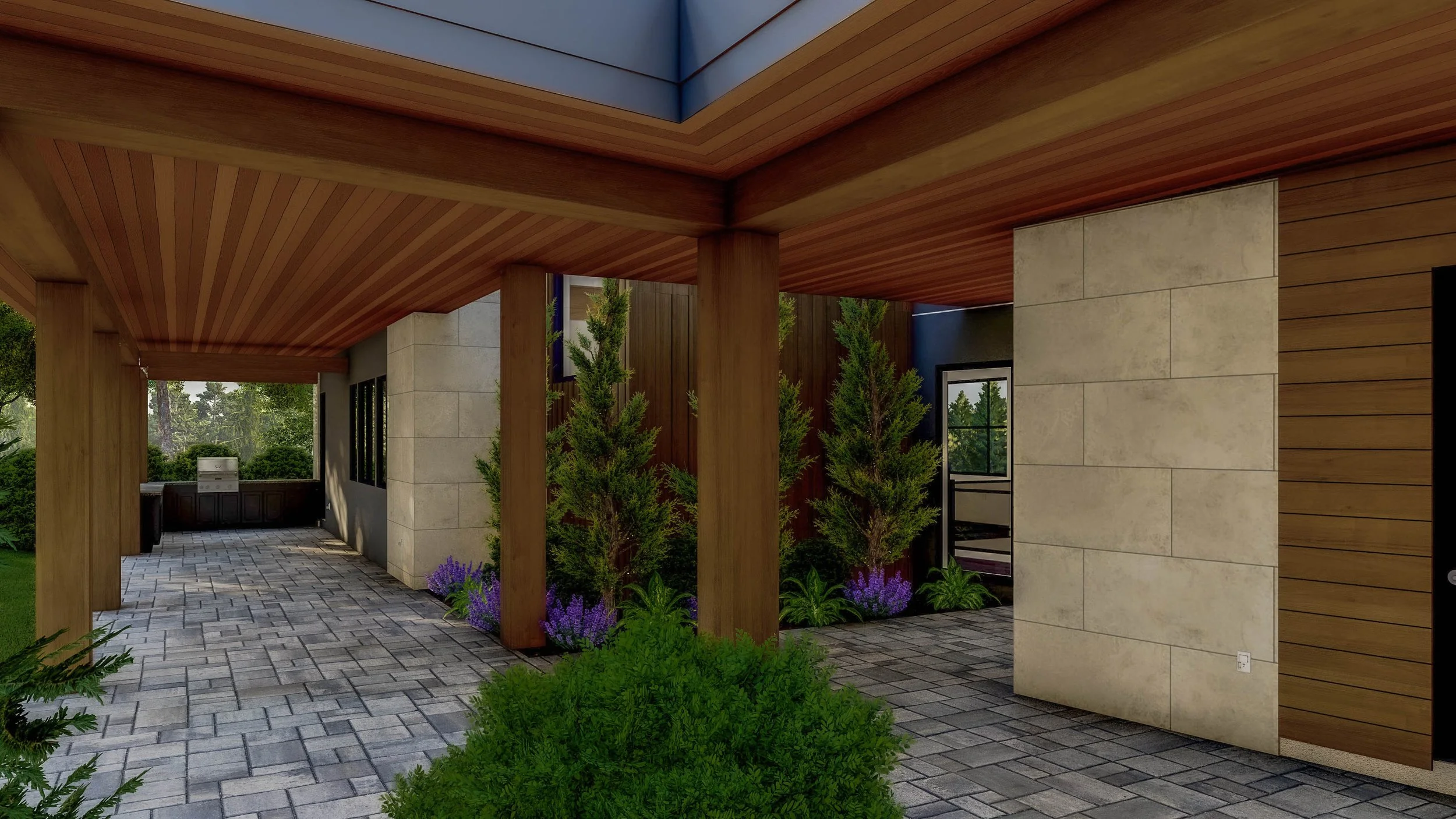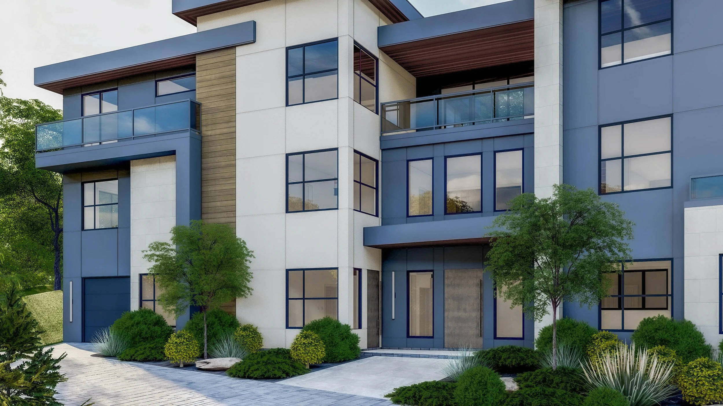 The entry sequence is thoughtfully articulated, with subtle recesses and overhangs that create a sense of arrival and shelter. Glass-railed balconies and a rooftop terrace extend living spaces outward, reinforcing the home’s connection to nature. The integrated garage, clad in complementary materials, blends seamlessly into the overall composition, maintaining the clean architectural expression.