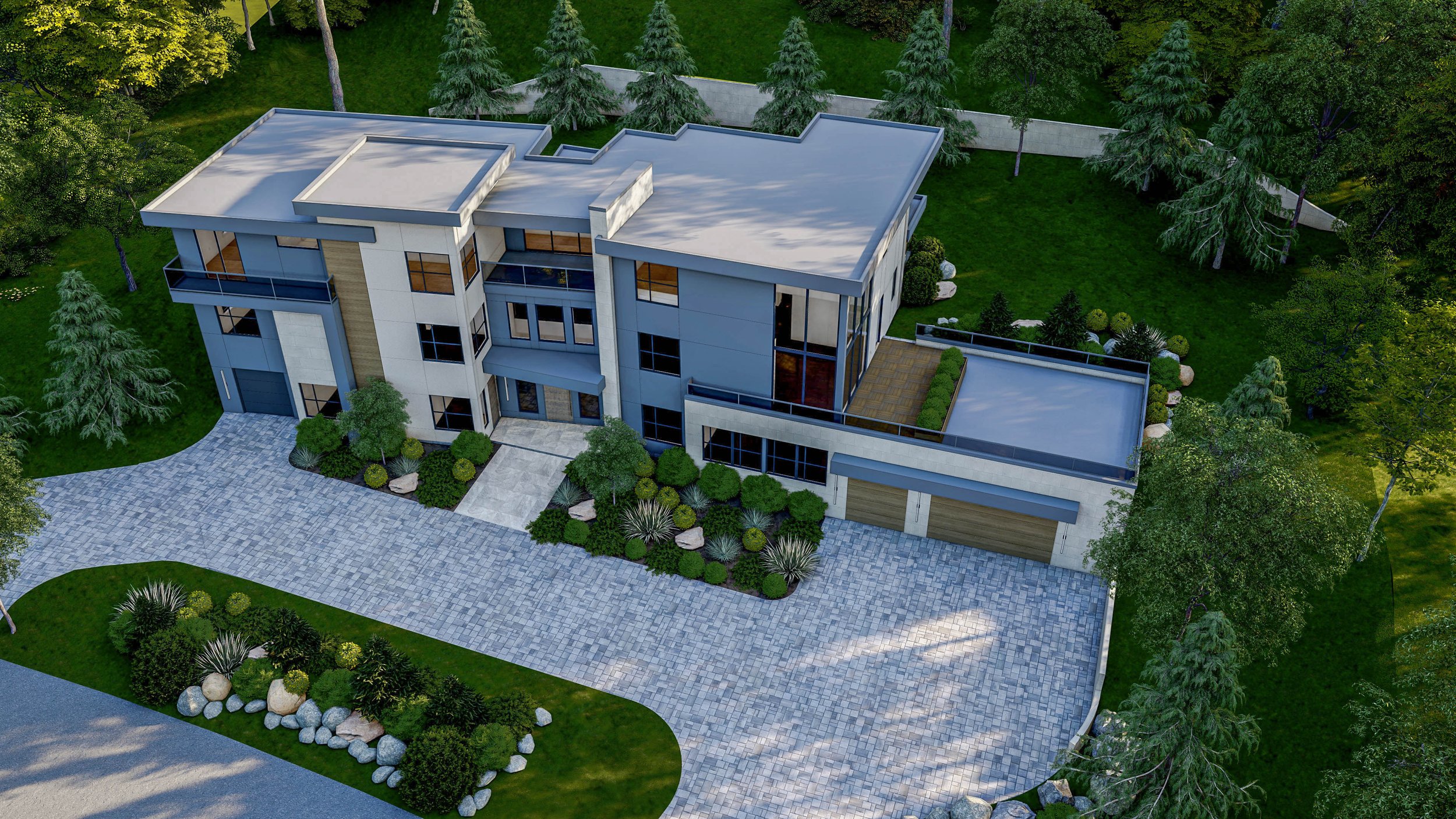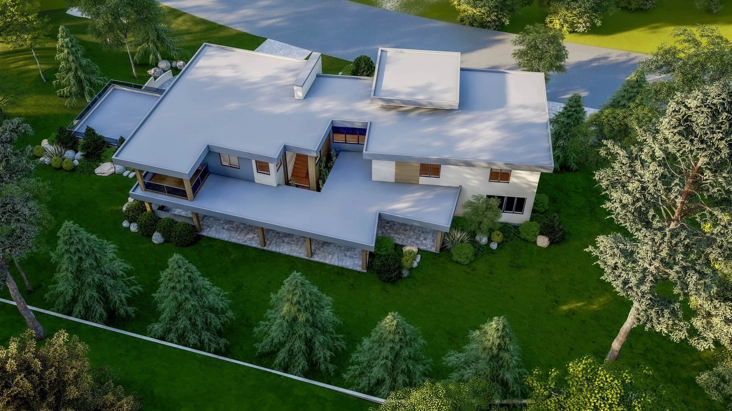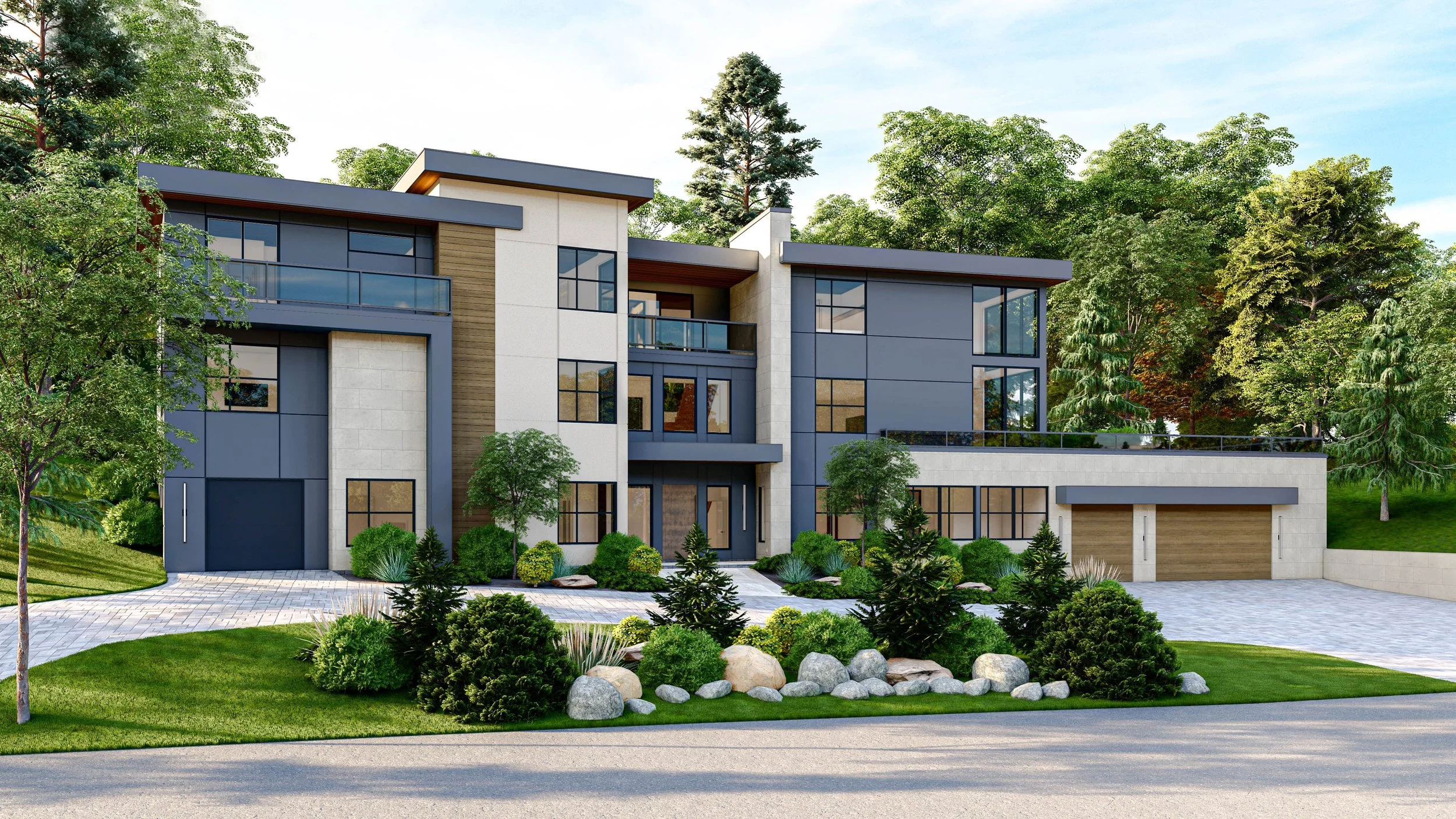 Lush, sculpted landscaping softens the strong architectural lines, enhancing curb appeal while anchoring the home within its wooded setting. The result is a residence that feels both bold and welcoming—an elevated expression of modern living designed for light, openness, and seamless indoor-outdoor connection.