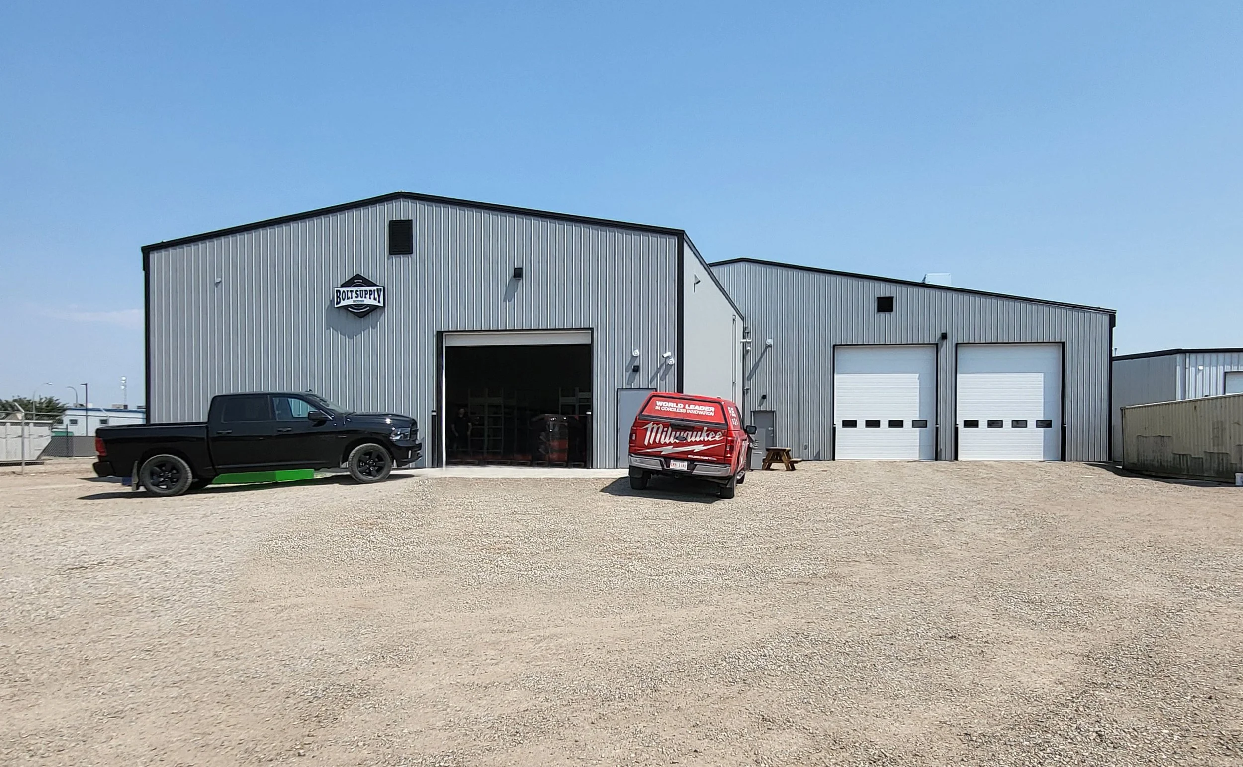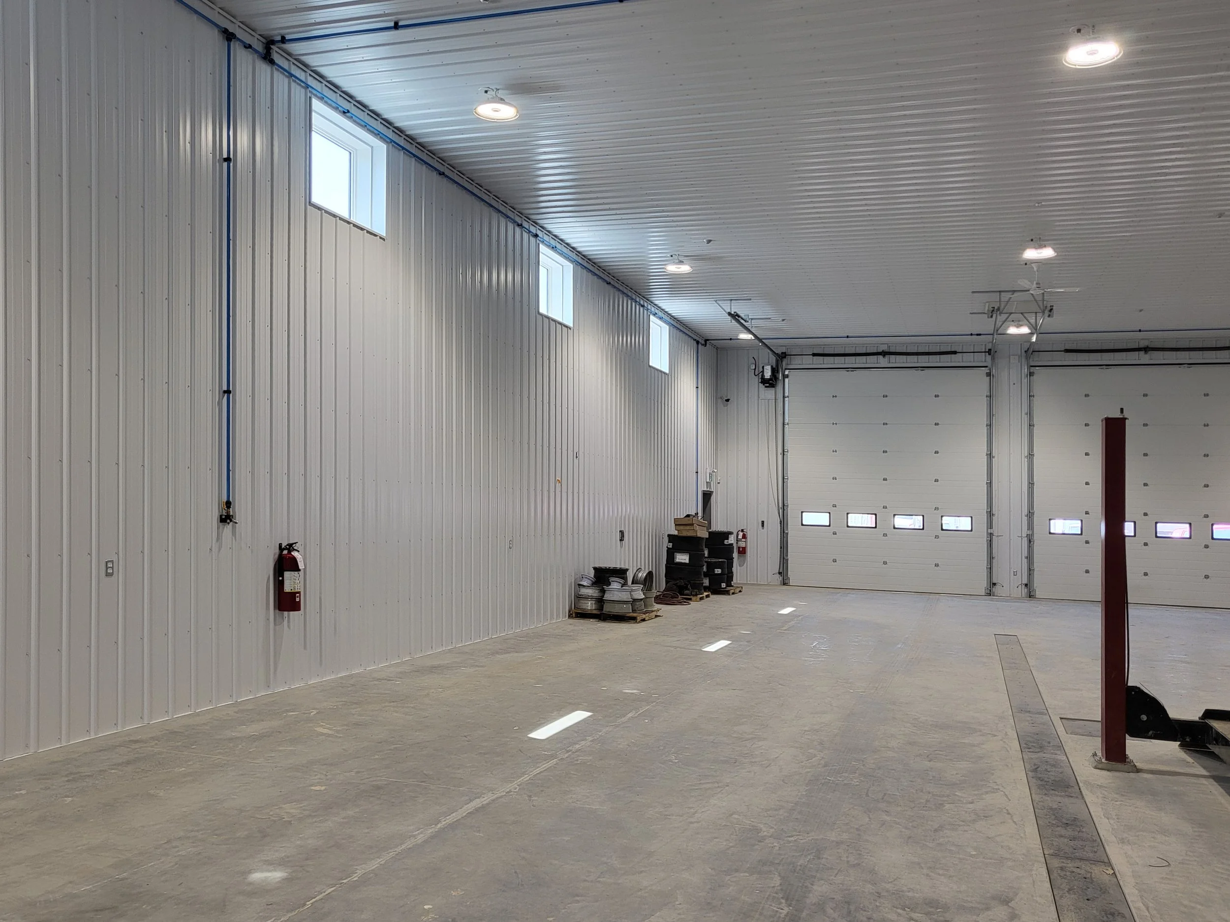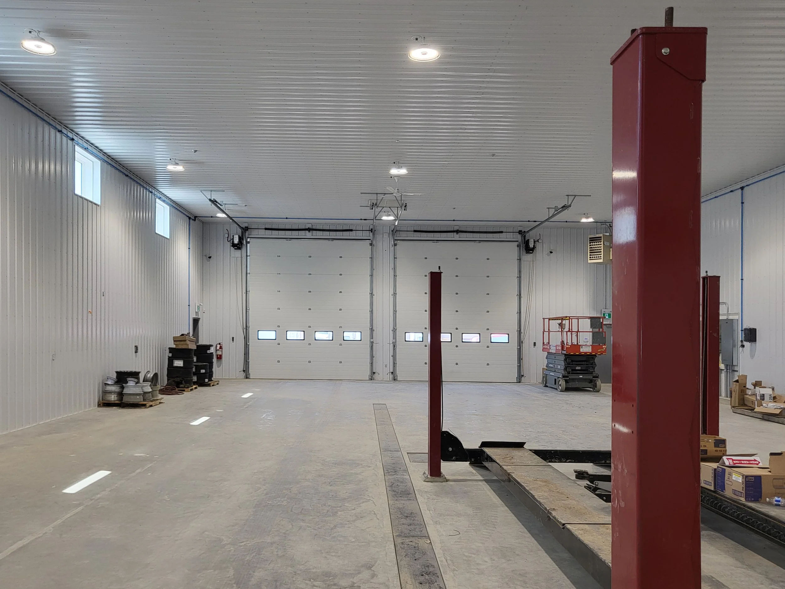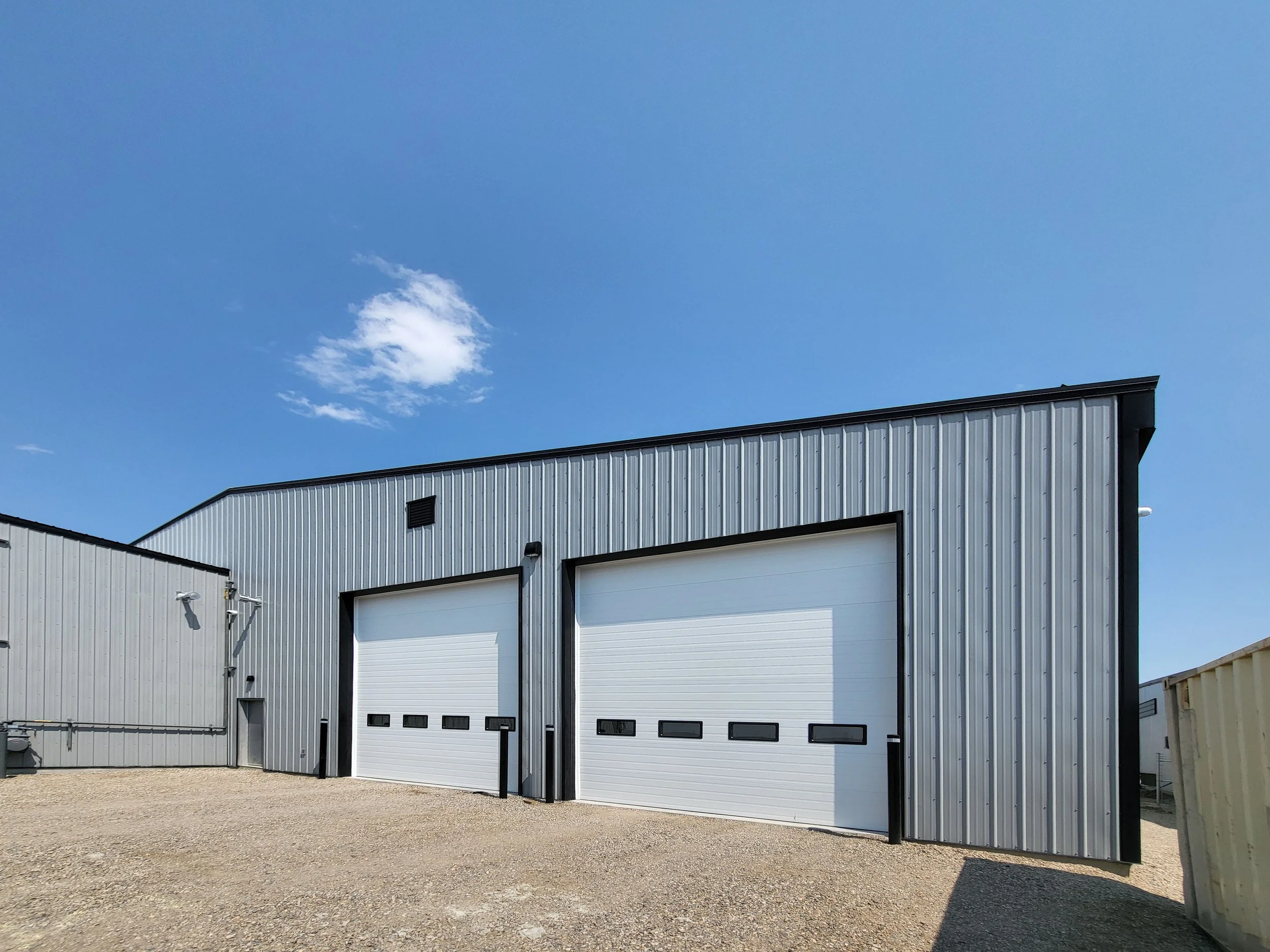 A large overhead service door is thoughtfully incorporated, maintaining alignment and material continuity. Dark metal trim and canopy elements add depth and shadow, enhancing the building’s proportions.