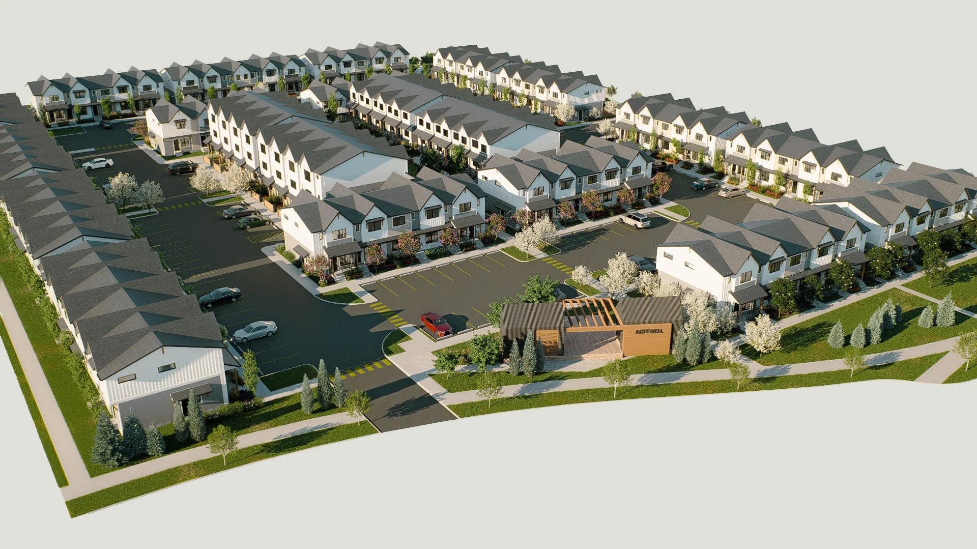 This 155-unit modern farmhouse community features 21 thoughtfully arranged buildings, landscaped streets, integrated parking, and a central clubhouse, blending timeless character with contemporary neighborhood connectivity.