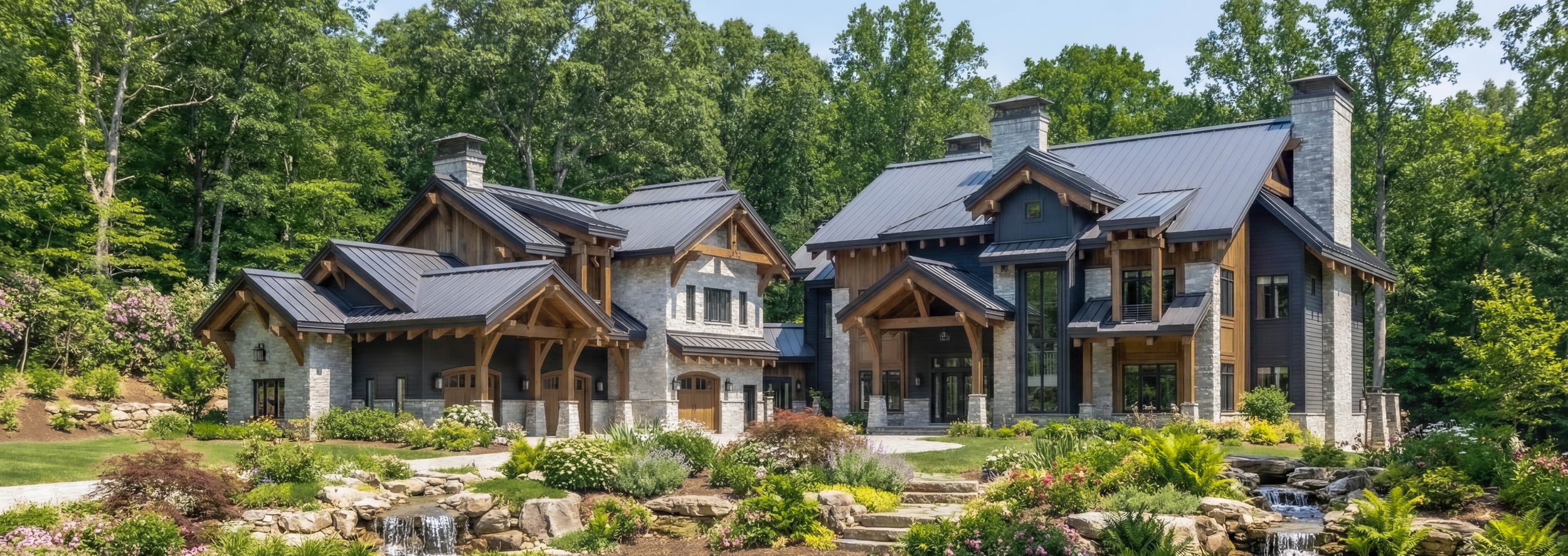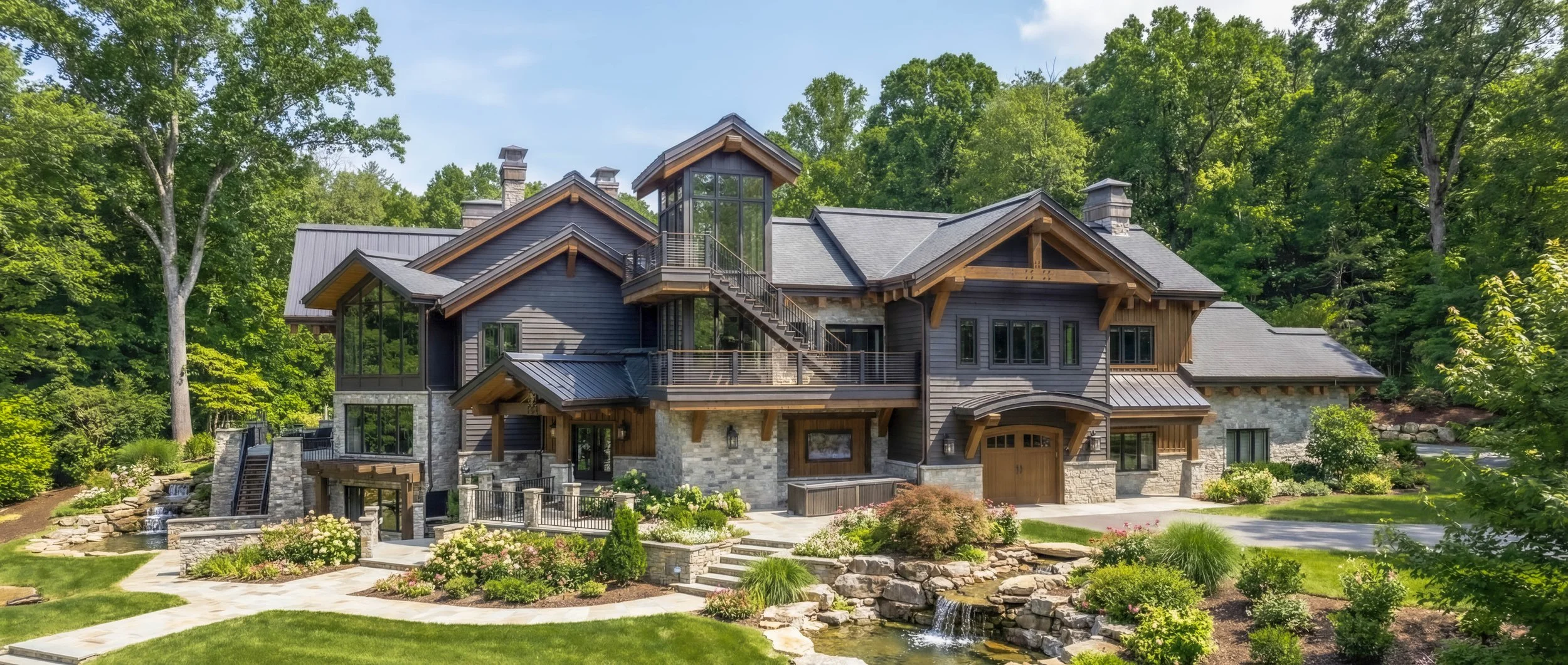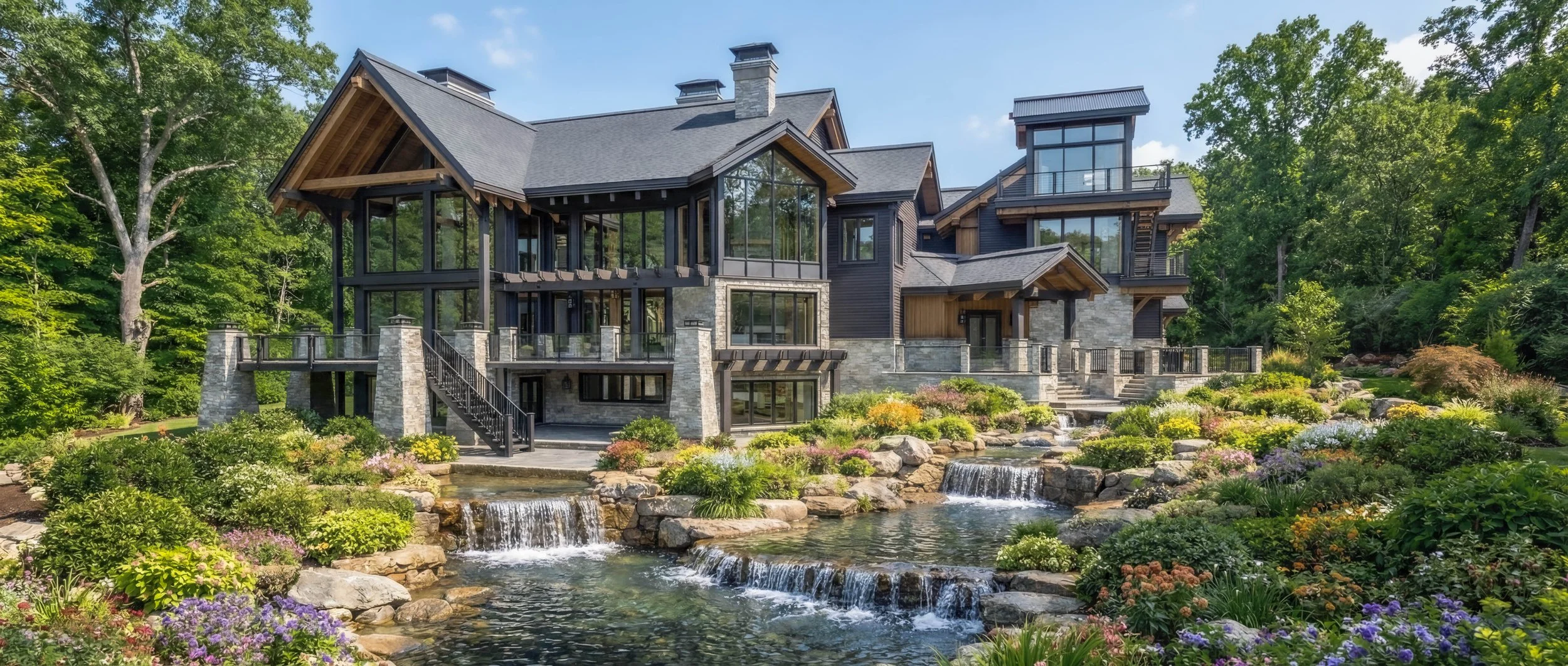 Steeply pitched rooflines, exposed timber beams, and expansive walls of glass define its dramatic yet welcoming presence. Natural stone grounds the lower levels, while rich wood siding and dark trim add depth above. Floor-to-ceiling windows frame sweeping mountain views and flood the open-concept interior with natural light, strengthening the connection to its surroundings.