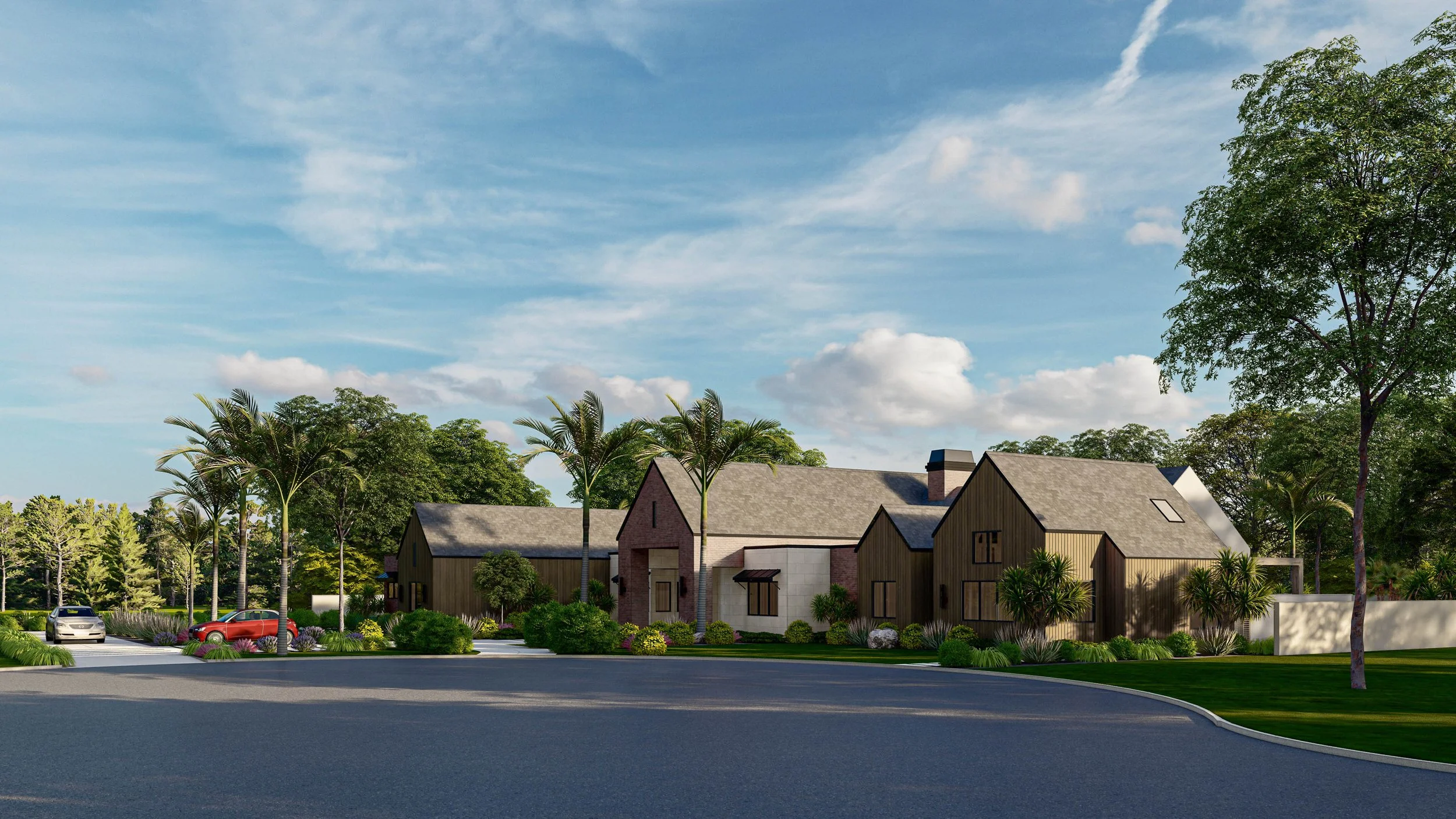 The exterior palette blends warm wood cladding, brick, and stone, grounding the home in natural textures while maintaining a clean, contemporary aesthetic. Simple rooflines and crisp edges lend a sense of order and permanence, while carefully placed openings and courtyards invite light and air deep into the plan. The central entry is framed with restraint and symmetry, offering a quiet moment of arrival that feels both welcoming and composed.