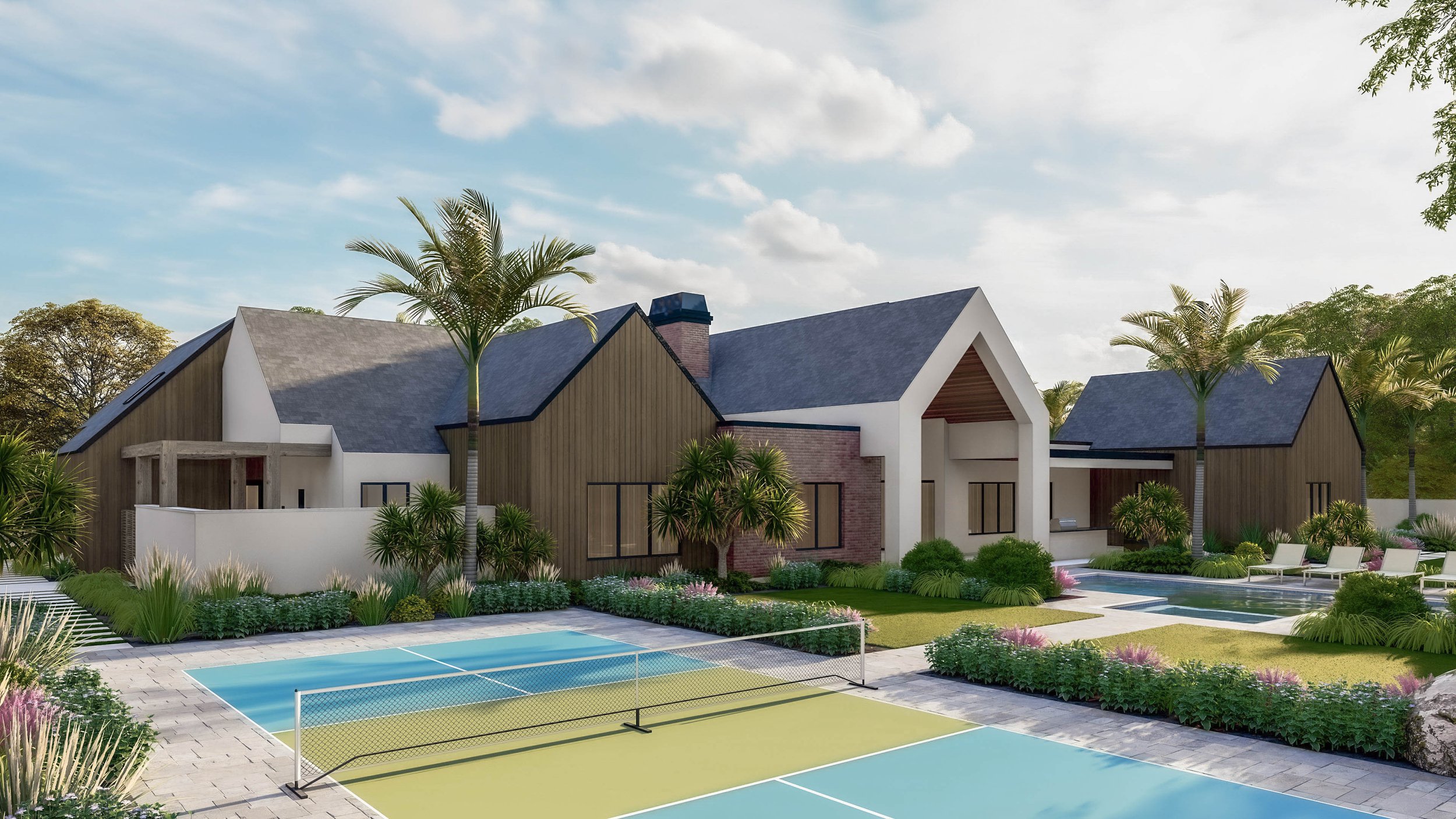The home reveals its true character through a sequence of outdoor rooms and private courtyards that blur the line between interior and landscape. Living spaces open seamlessly to gardens, terraces, and water features, creating a rhythm of enclosure and openness throughout the property. The site is fully engaged, with the home unfolding toward the rear amenities, where pool and recreation areas are integrated into the landscape as extensions of everyday living.