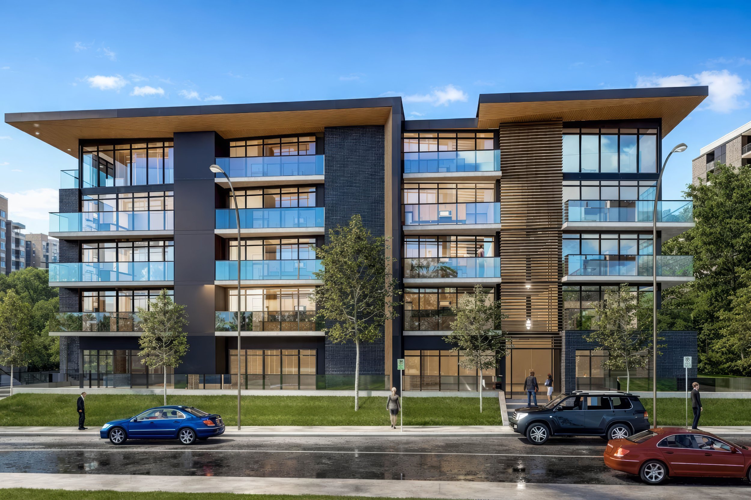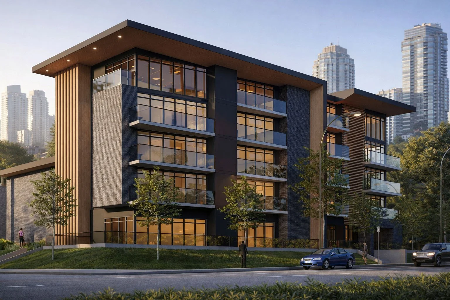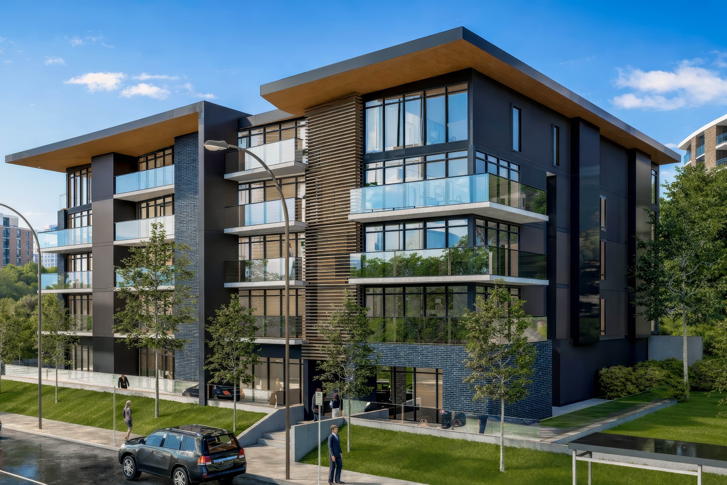 Designed with contemporary urban living in mind, the Mission St. concept integrates seamlessly into its context through a harmonious blend of warm natural materials and expansive glazing. The interplay of wood and glass softens the modern lines, creating transparency, warmth, and connection to the surrounding streetscape. Its streamlined, wing-like façade expresses forward movement and modernity, yet the careful material selection and proportional balance maintain a respectful dialogue with the architectural character of the past.
