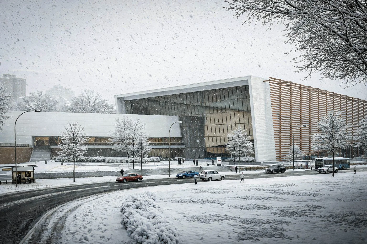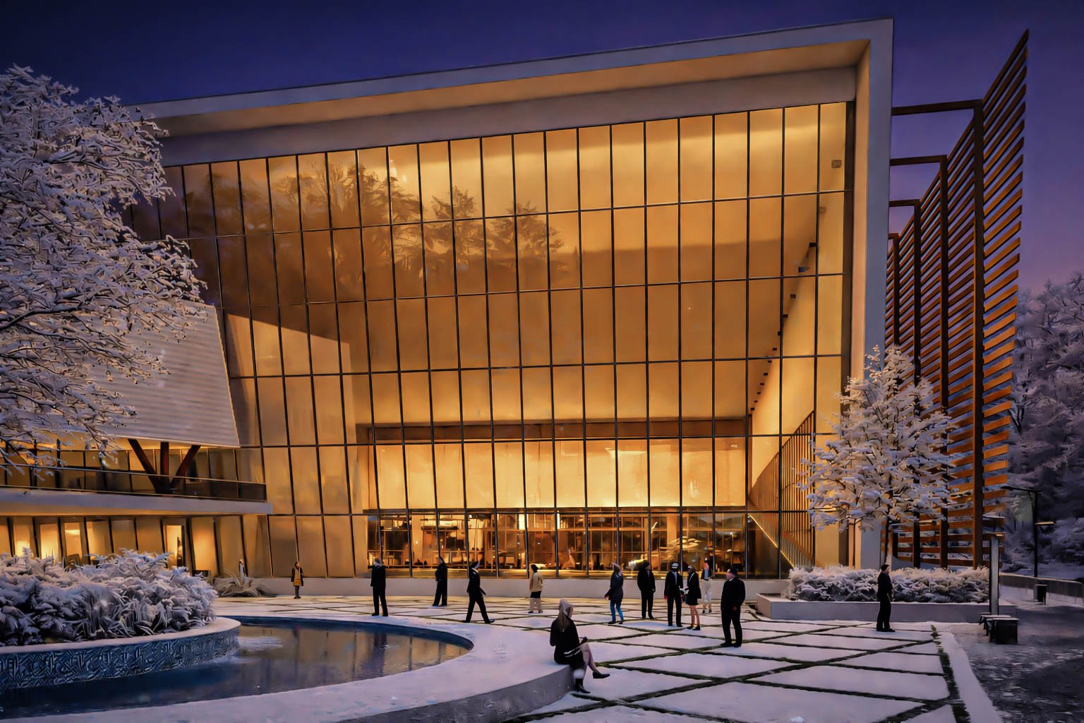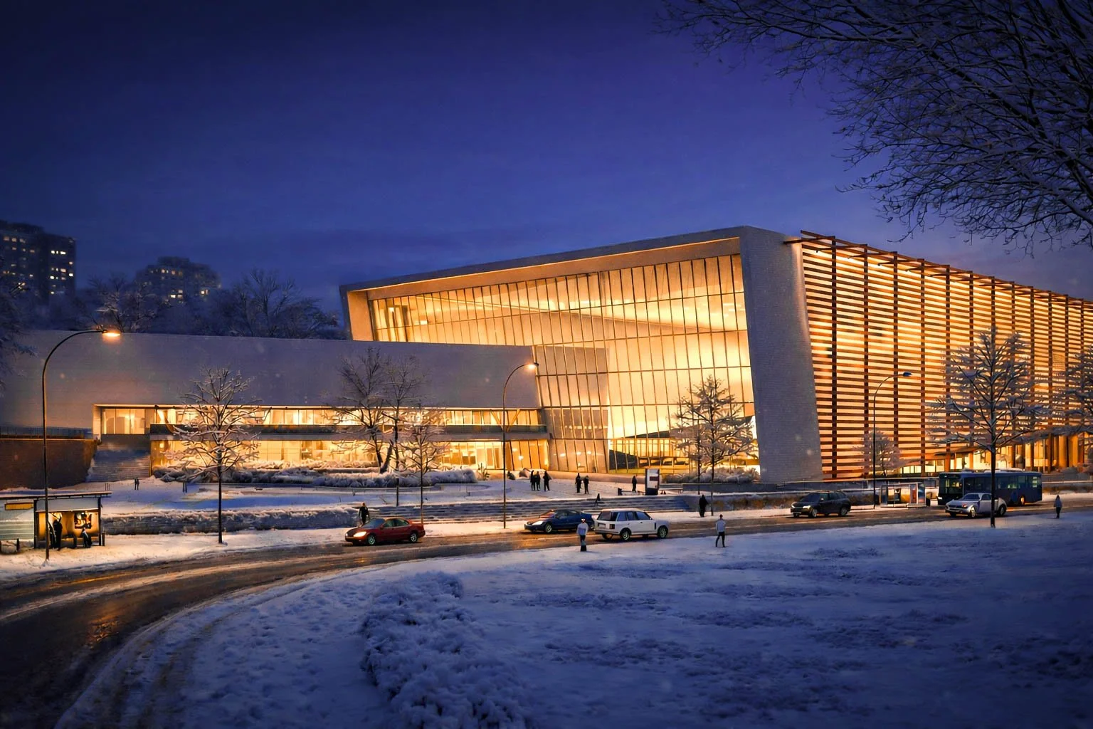 A dramatic glazed façade reveals the illuminated natatorium, casting a warm glow against the winter landscape. The curtain wall creates a dynamic dialogue between interior activity and exterior setting while expressive structural framing adds rhythm and reinforces the building’s architectural identity.