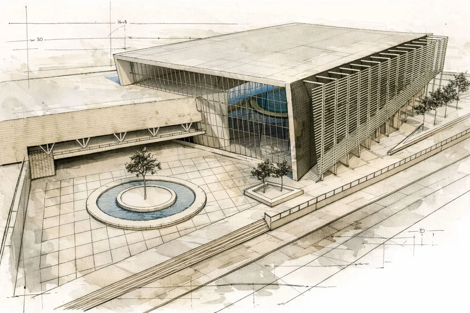 Anchored by a welcoming public plaza, the facility serves as both a functional aquatic venue and a compelling cinematic backdrop—robust yet transparent, monumental yet inviting.