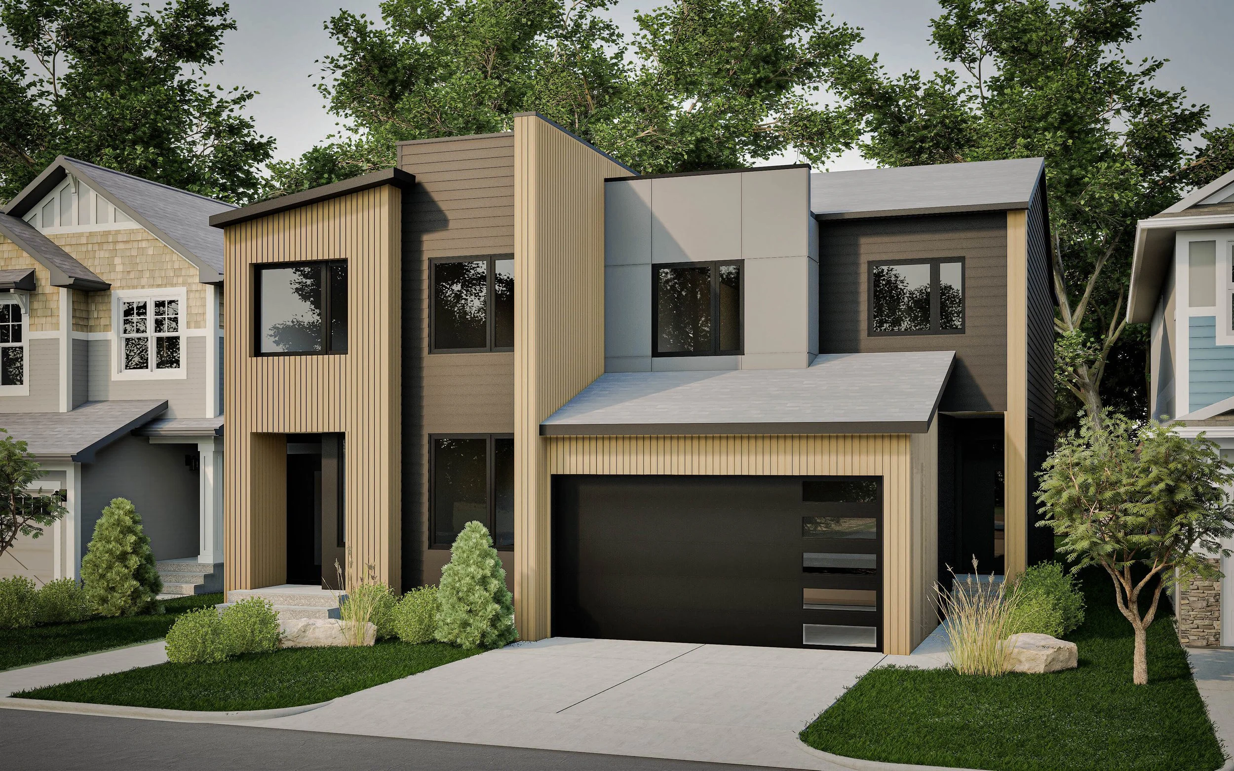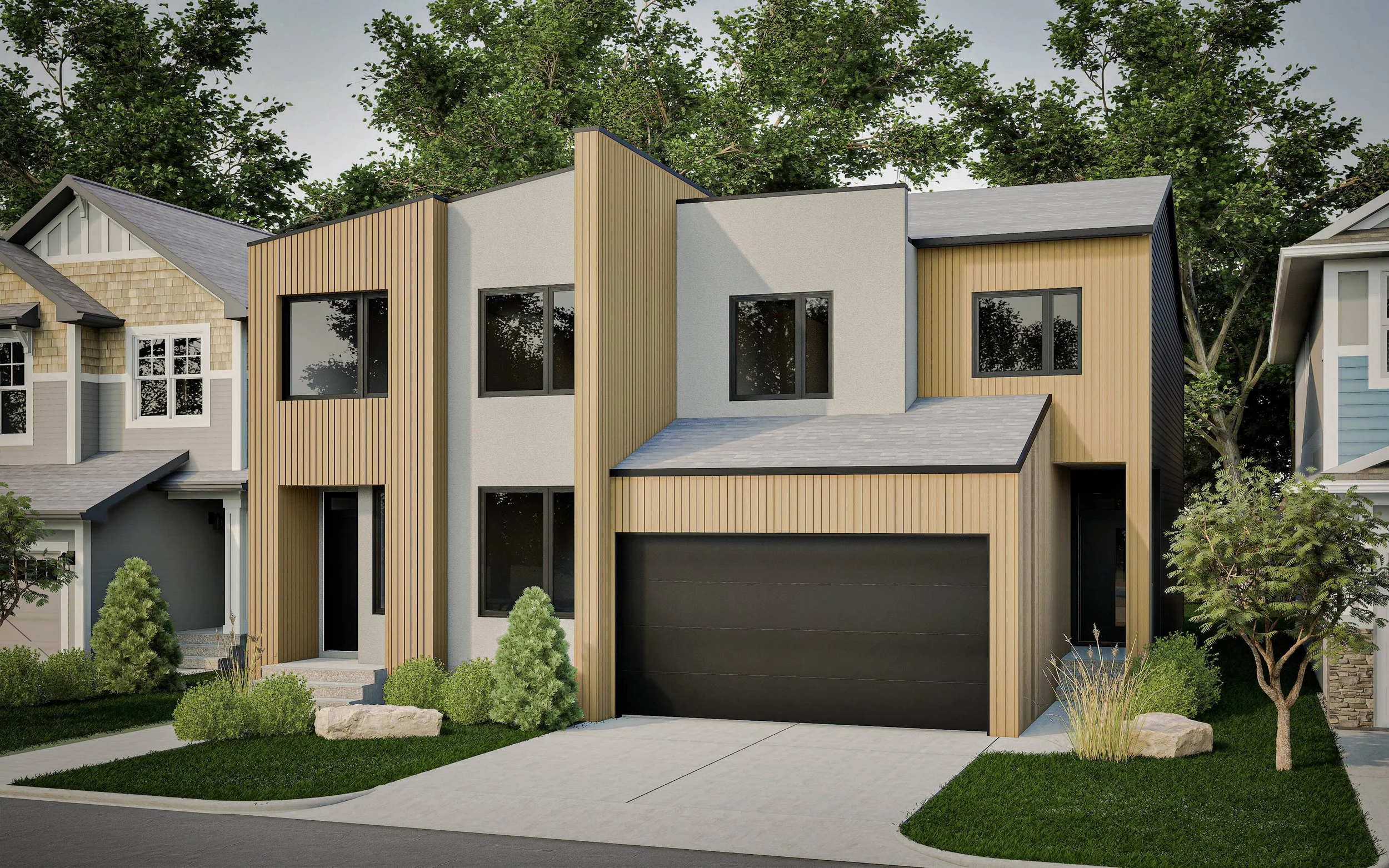 Two models embrace a bold contemporary language defined by clean lines, vertical elements, and layered materials. Smooth stucco, vertical wood cladding, and contrasting tones add depth and dimension, while expansive windows and sleek garage doors with integrated glazing reinforce their modern sophistication.