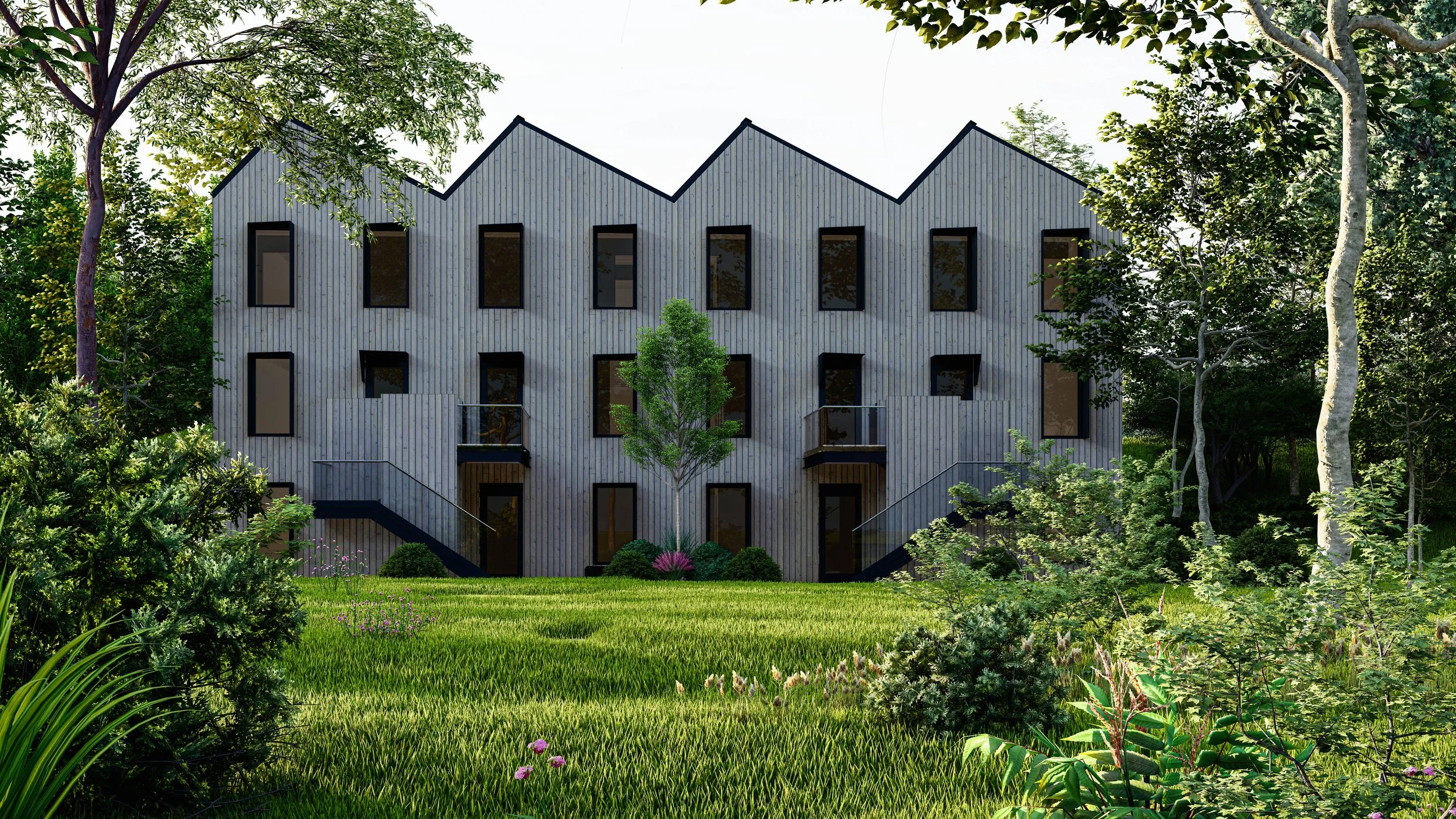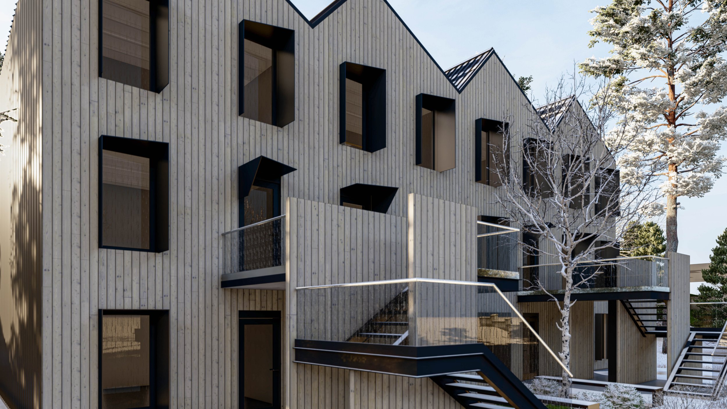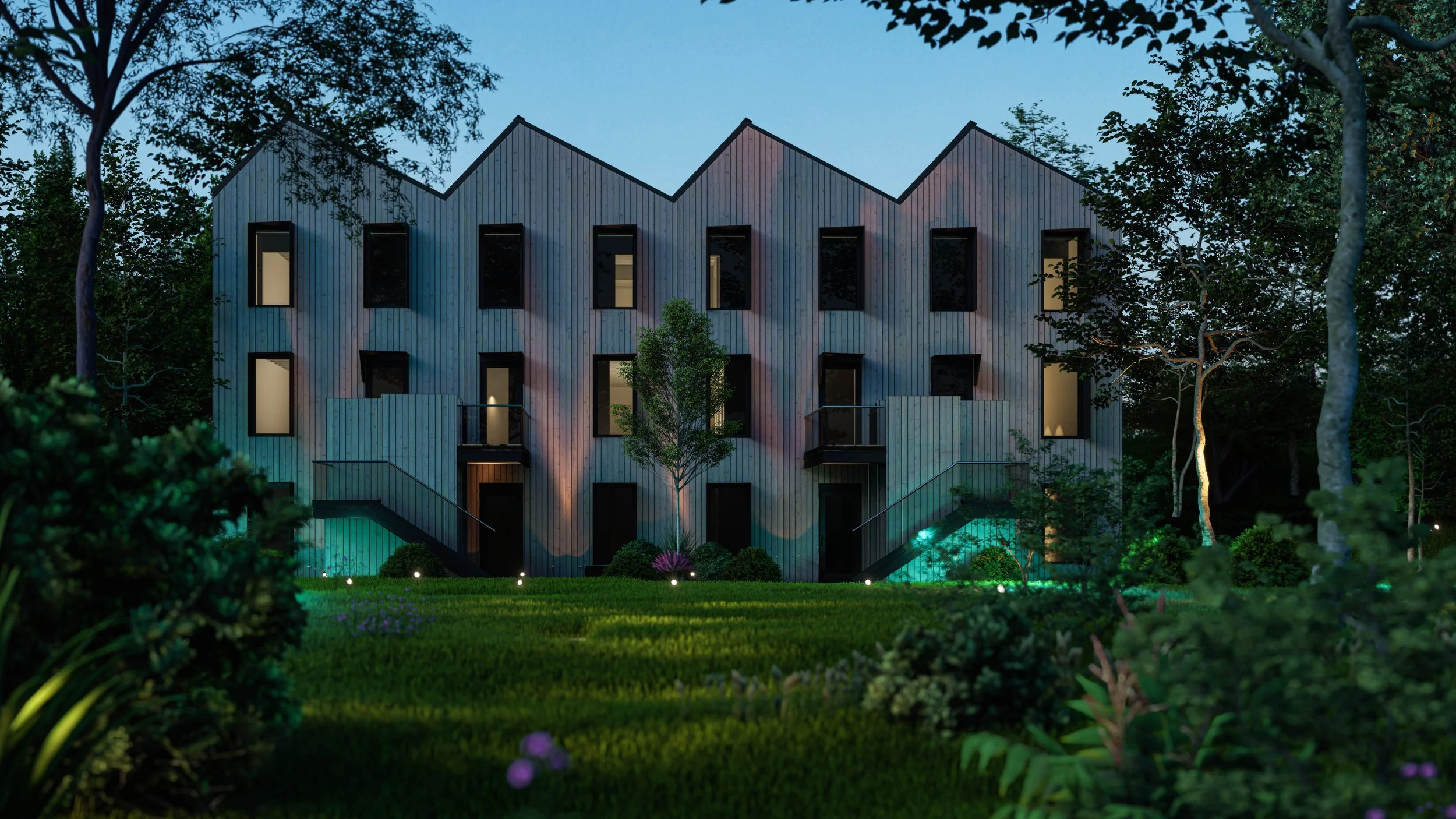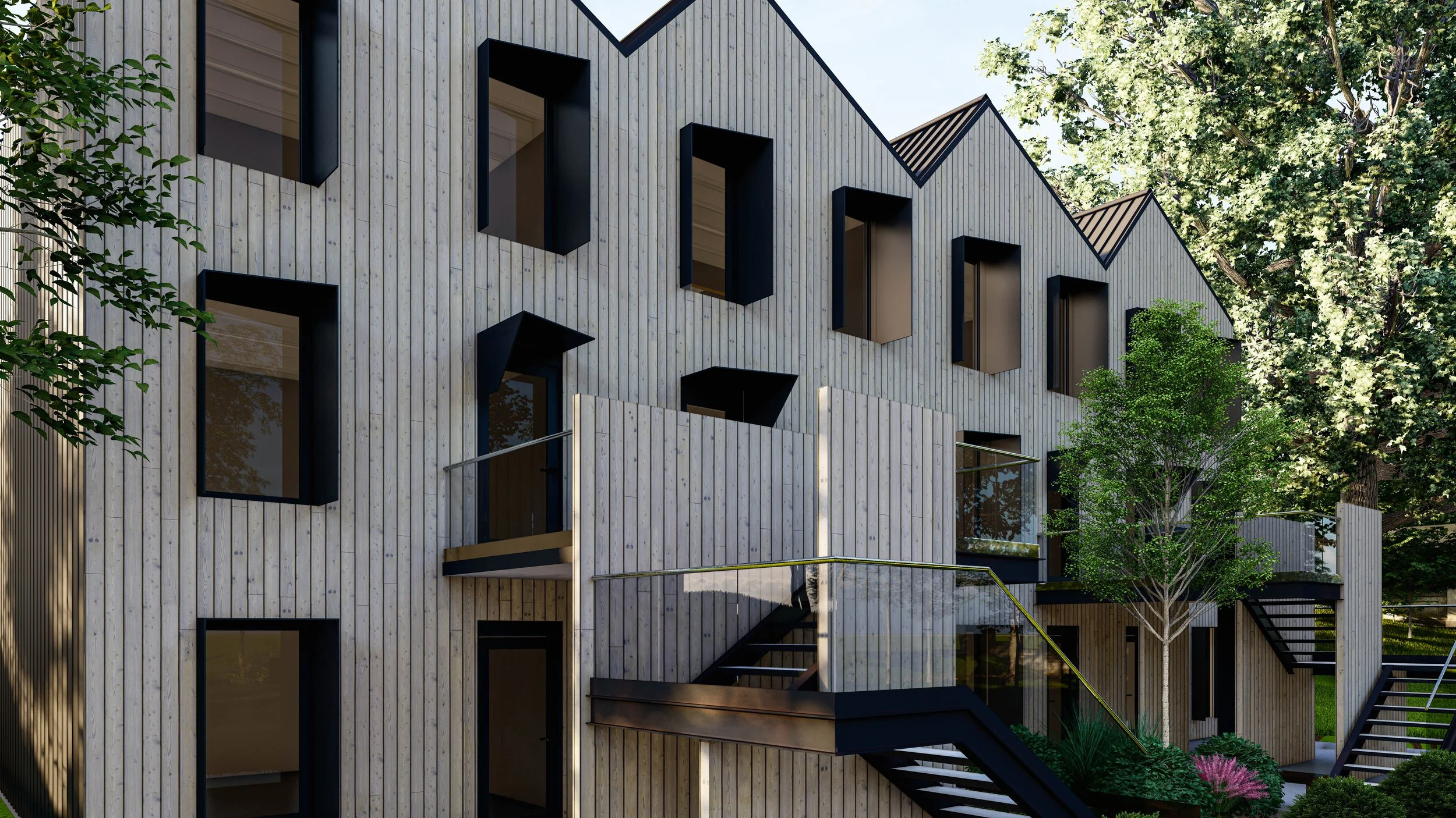 This Scandinavian-inspired residence expresses quiet confidence through clarity of form, material restraint, and rhythmic repetition. A sequence of steeply pitched gables steps across the skyline, reinterpreting traditional Nordic rooflines in a contemporary language. The repetition creates unity while suggesting individuality within each dwelling.
