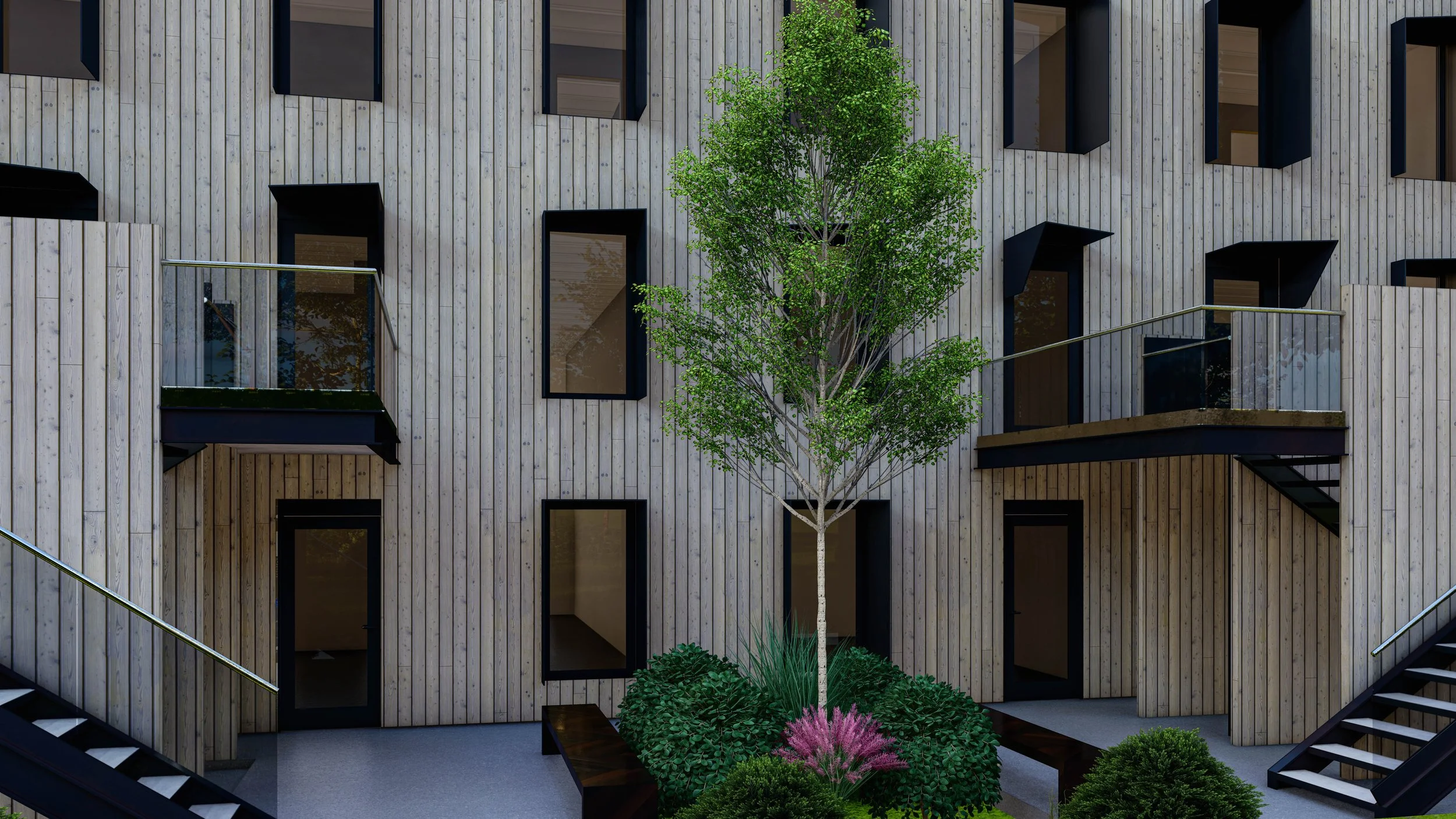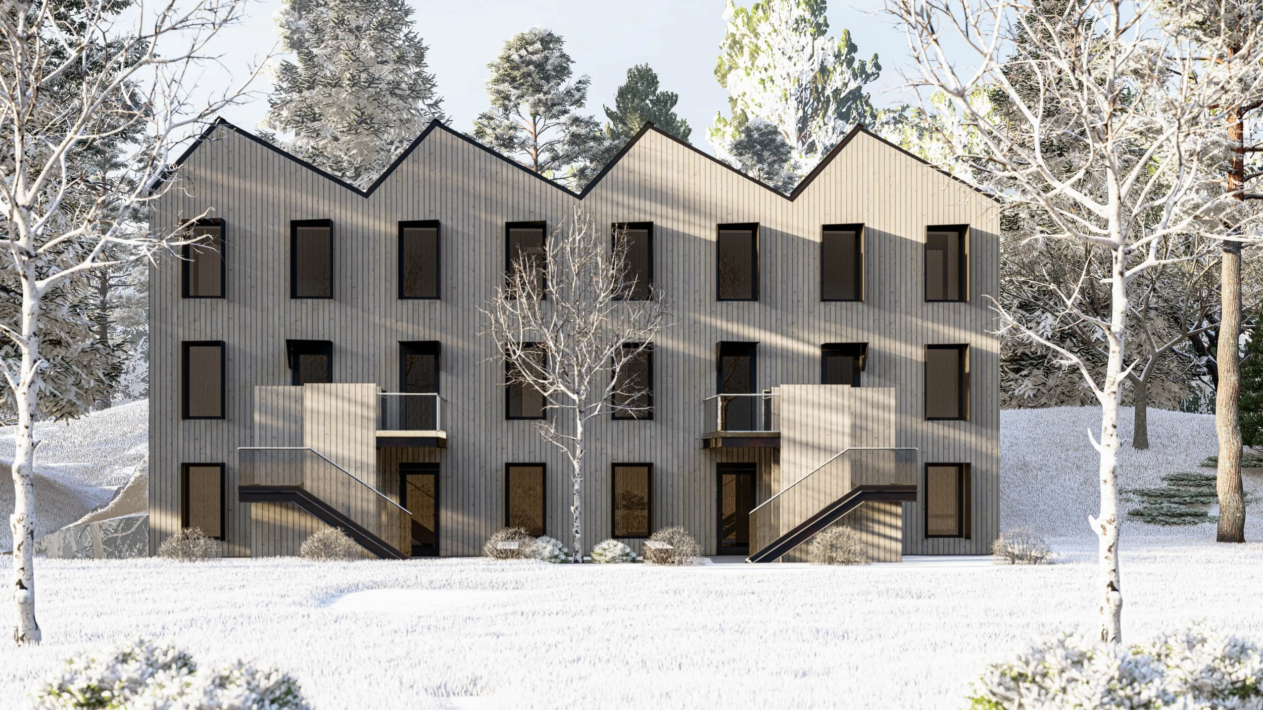 The façade is clad in vertical engineered wood like cladding, its subtle texture catching and diffusing light to emphasize the building’s sculptural geometry. The cool, muted palette reinforces the Scandinavian ethos of simplicity and durability, while clean lines and minimal ornament allow proportion and shadow to define the architecture.