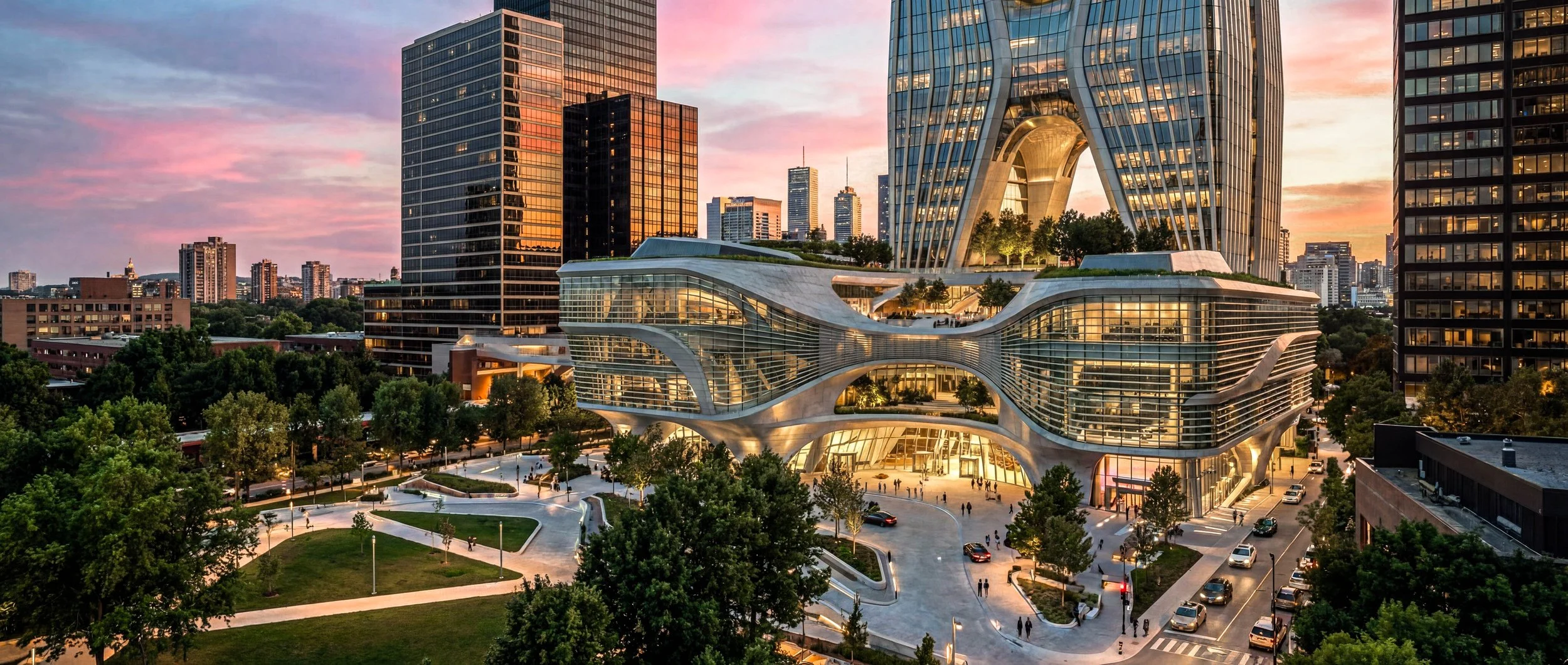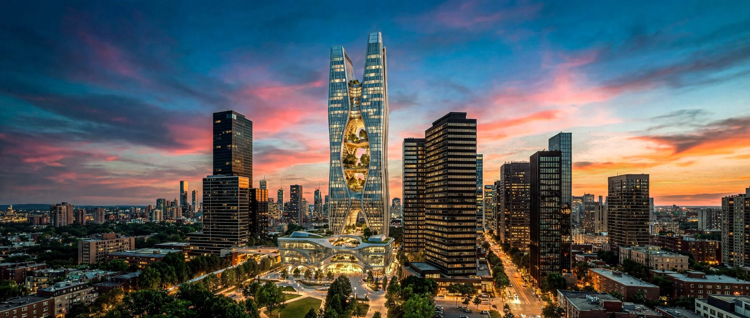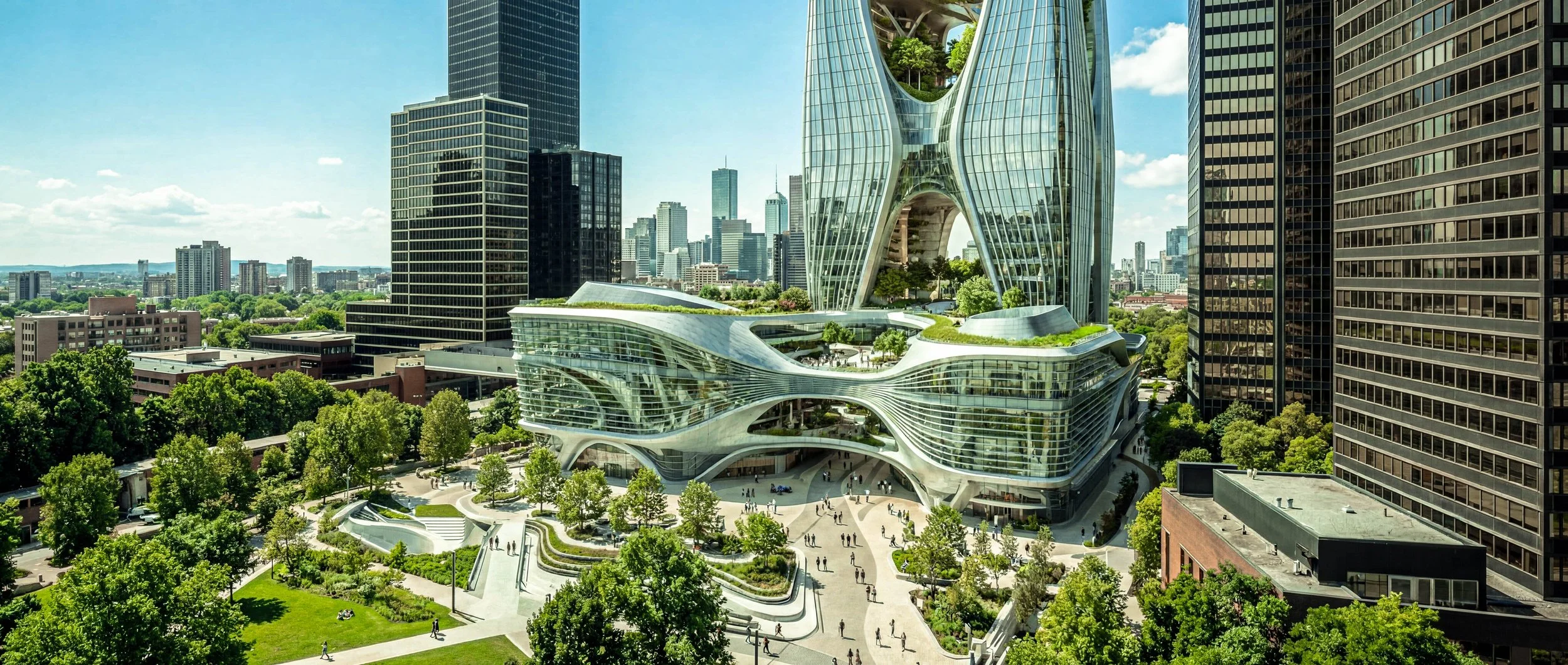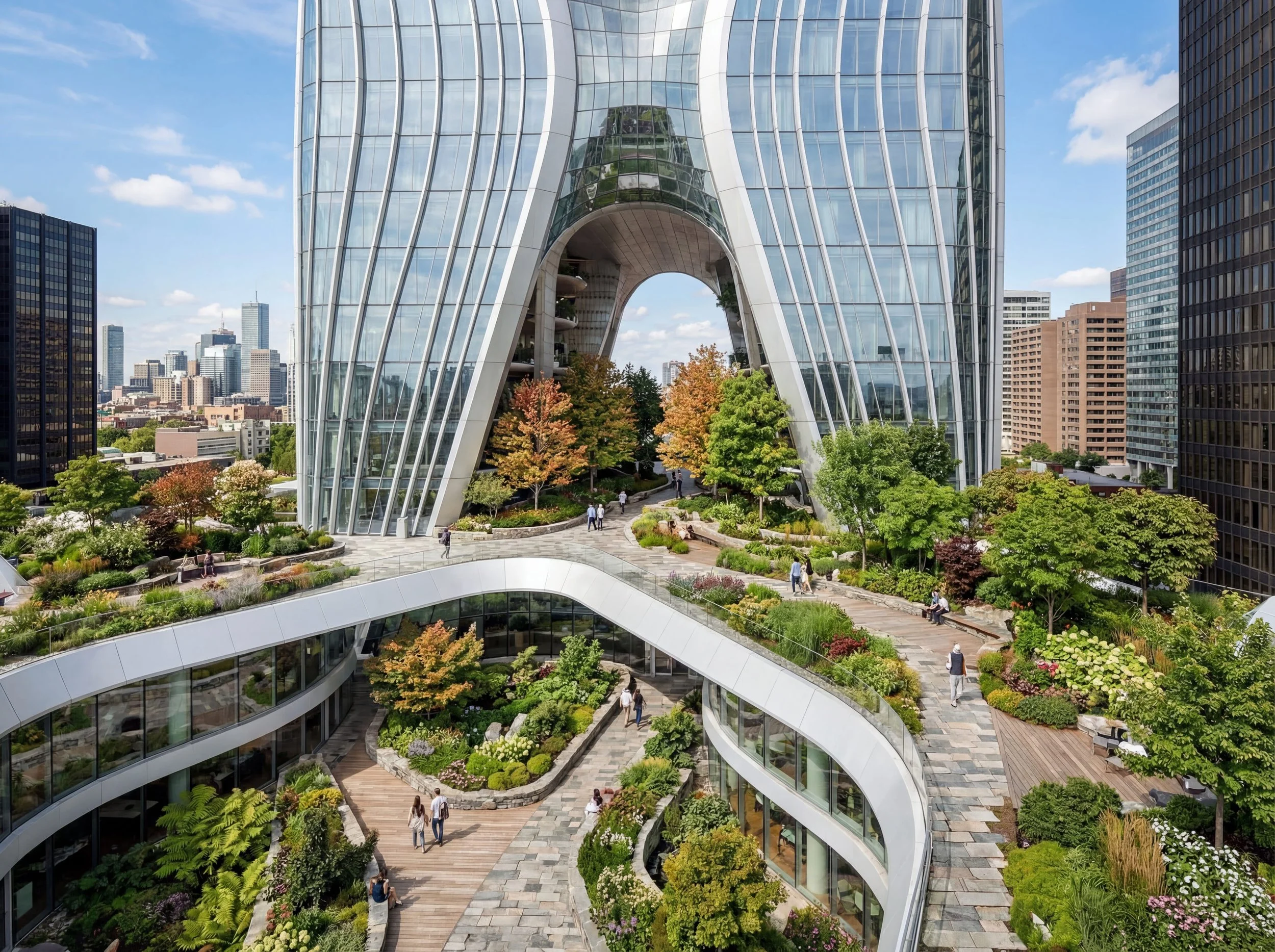 At ground level, a fluid podium anchors the composition, blending public plaza space with organic forms that echo the greenery above. The result is a harmonious dialogue between nature and skyline—an innovative high-rise community where architecture, landscape, and urban vitality converge in a bold yet graceful vertical ecosystem.