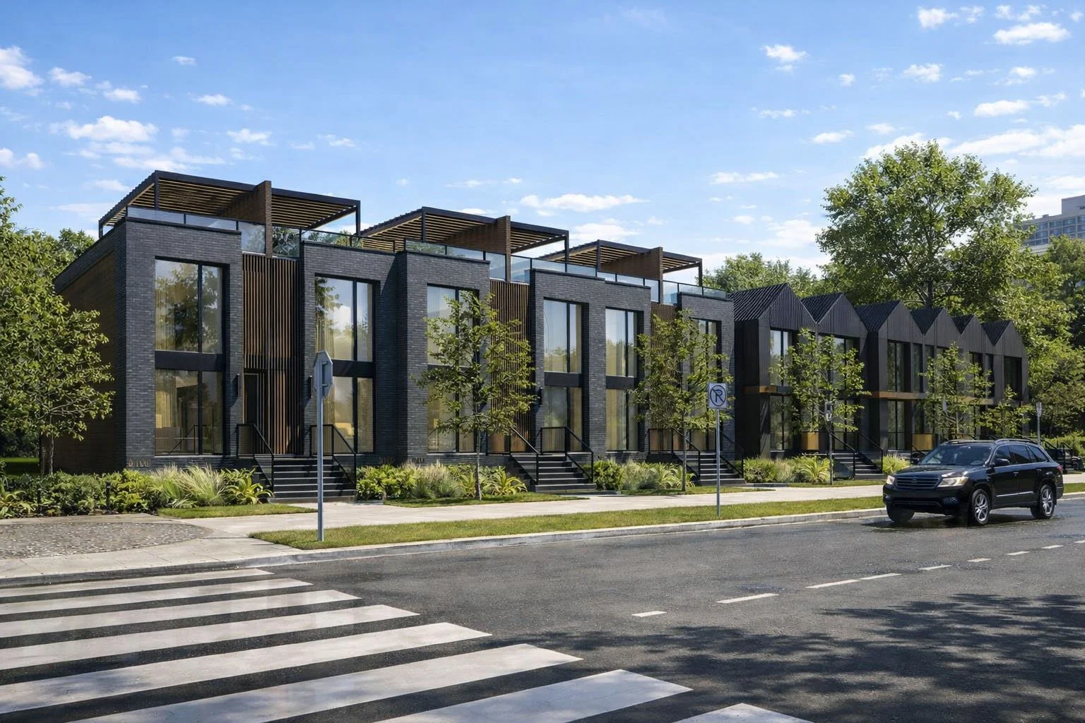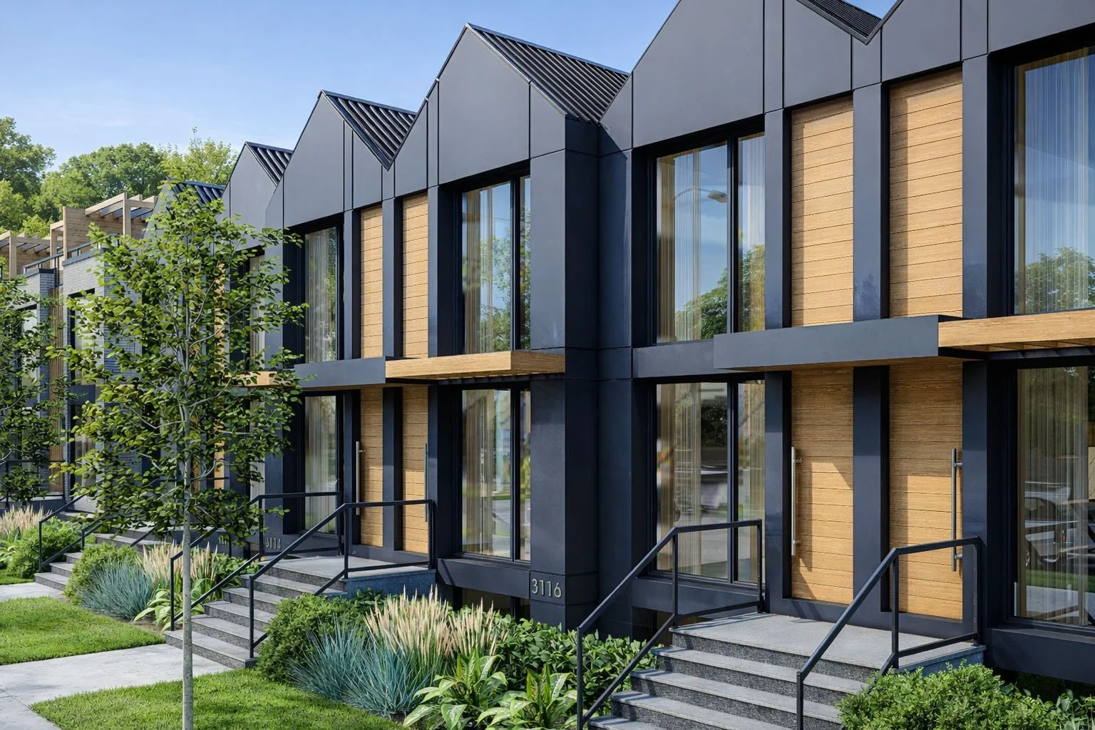 Building One features a modern aesthetic with expansive glazing and accessible rooftop patios set beneath natural wood pergolas, adding lightness and layered depth. Building Two adopts a contemporary character, defined by dark Hardie panel cladding, natural wood accents, and peaked zero-overhang roofs, creating strong visual rhythm along the street.