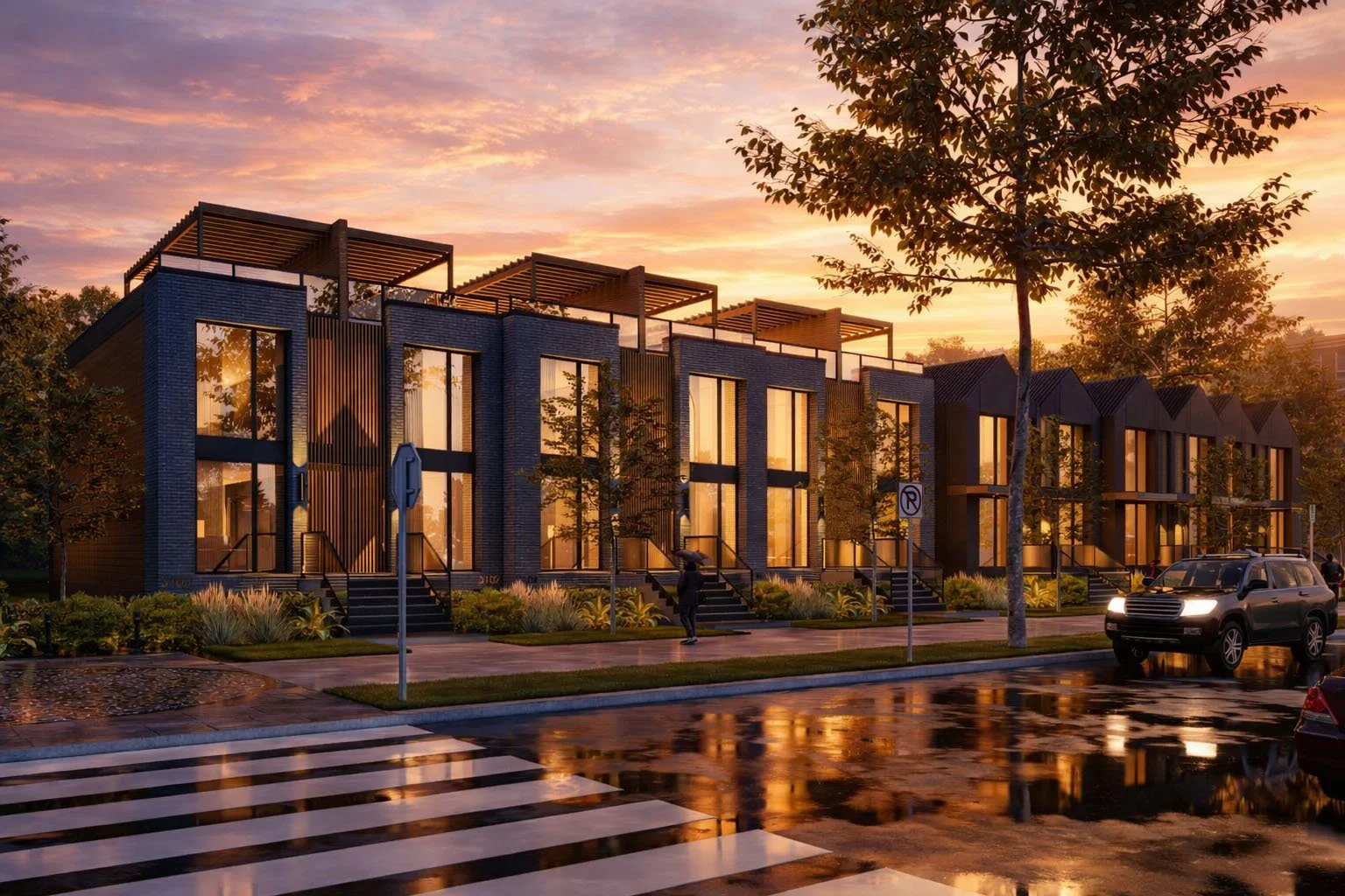 Elevated entries and transparent façades enhance the pedestrian experience, while warm interior light contrasts with the darker exterior materials—demonstrating that thoughtful density and compelling design can work seamlessly together.