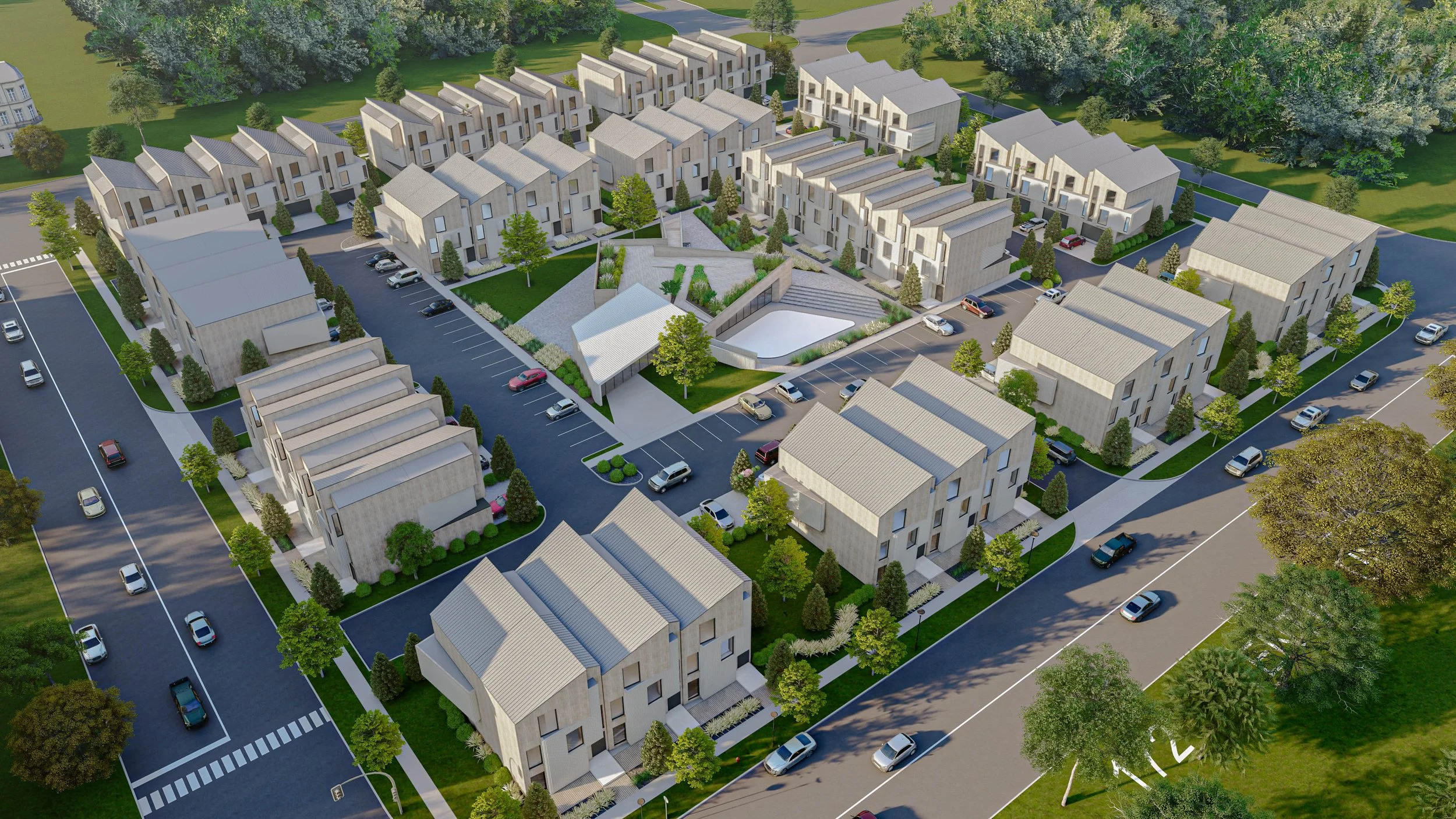 A pavilion-style amenity anchors the communal core, offering an exterior ice rink during winter months as well a gathering space defined by clean lines and understated materials. The result is a cohesive, walkable enclave that balances modern minimalism with warmth and human scale.