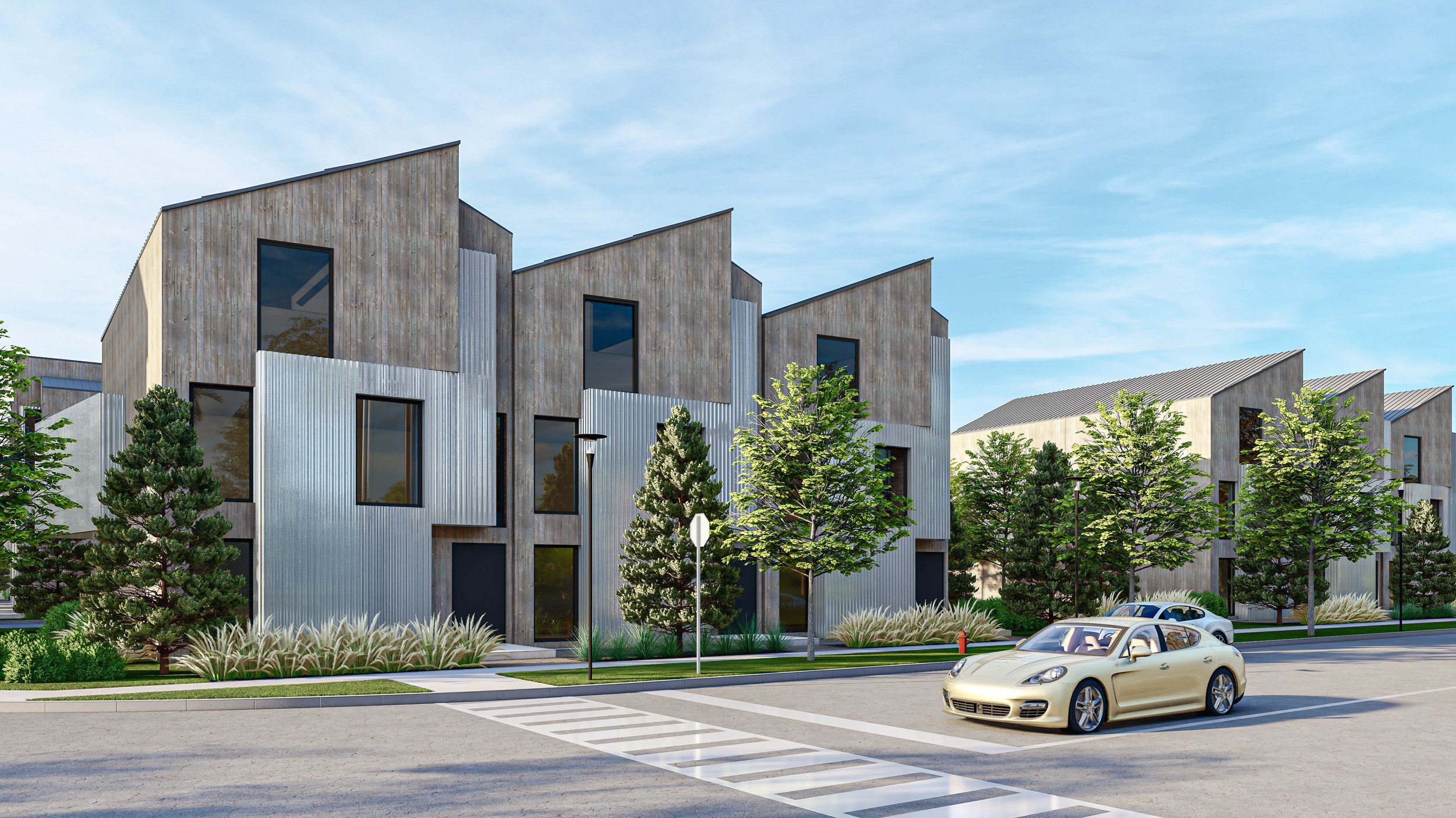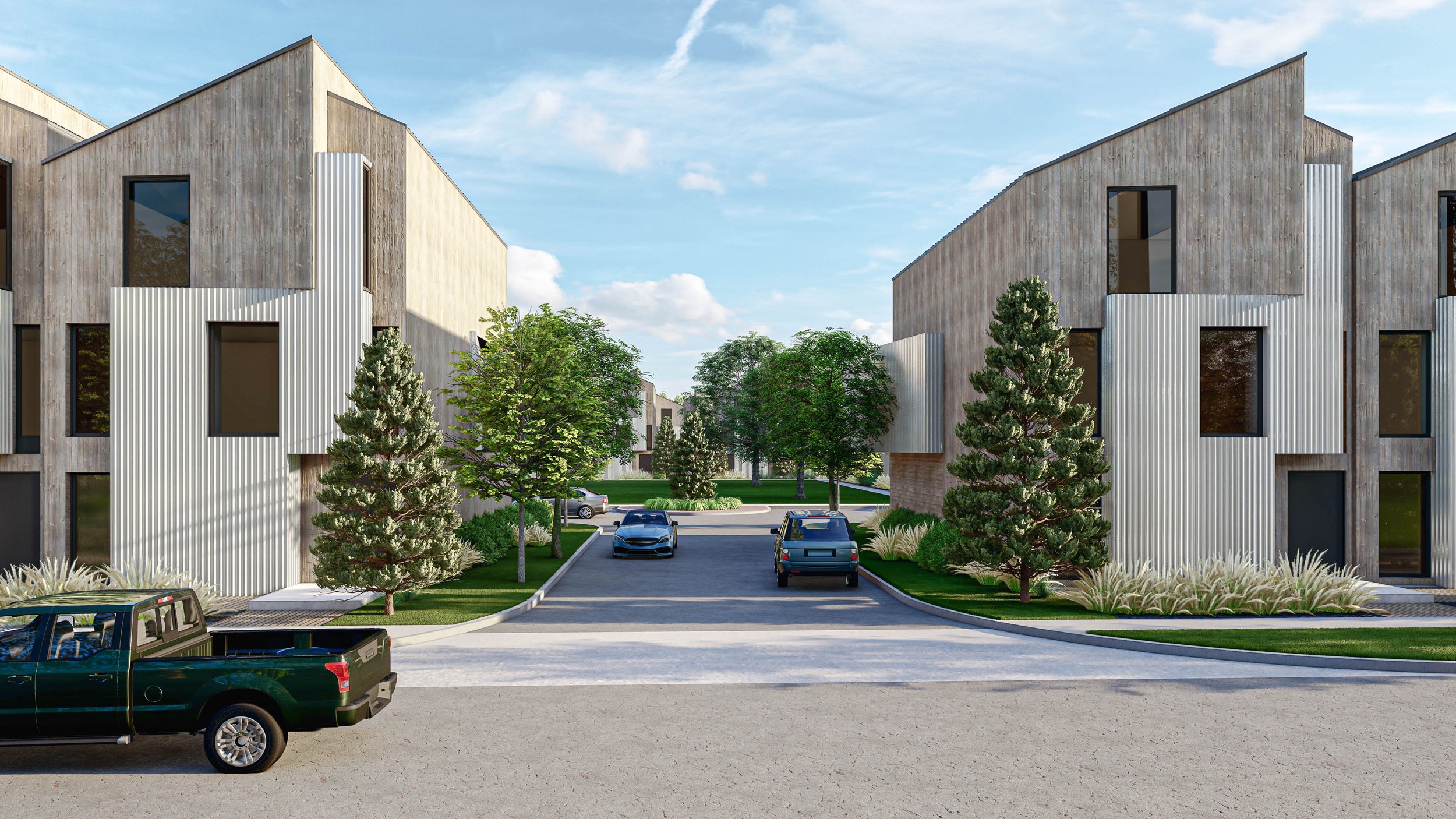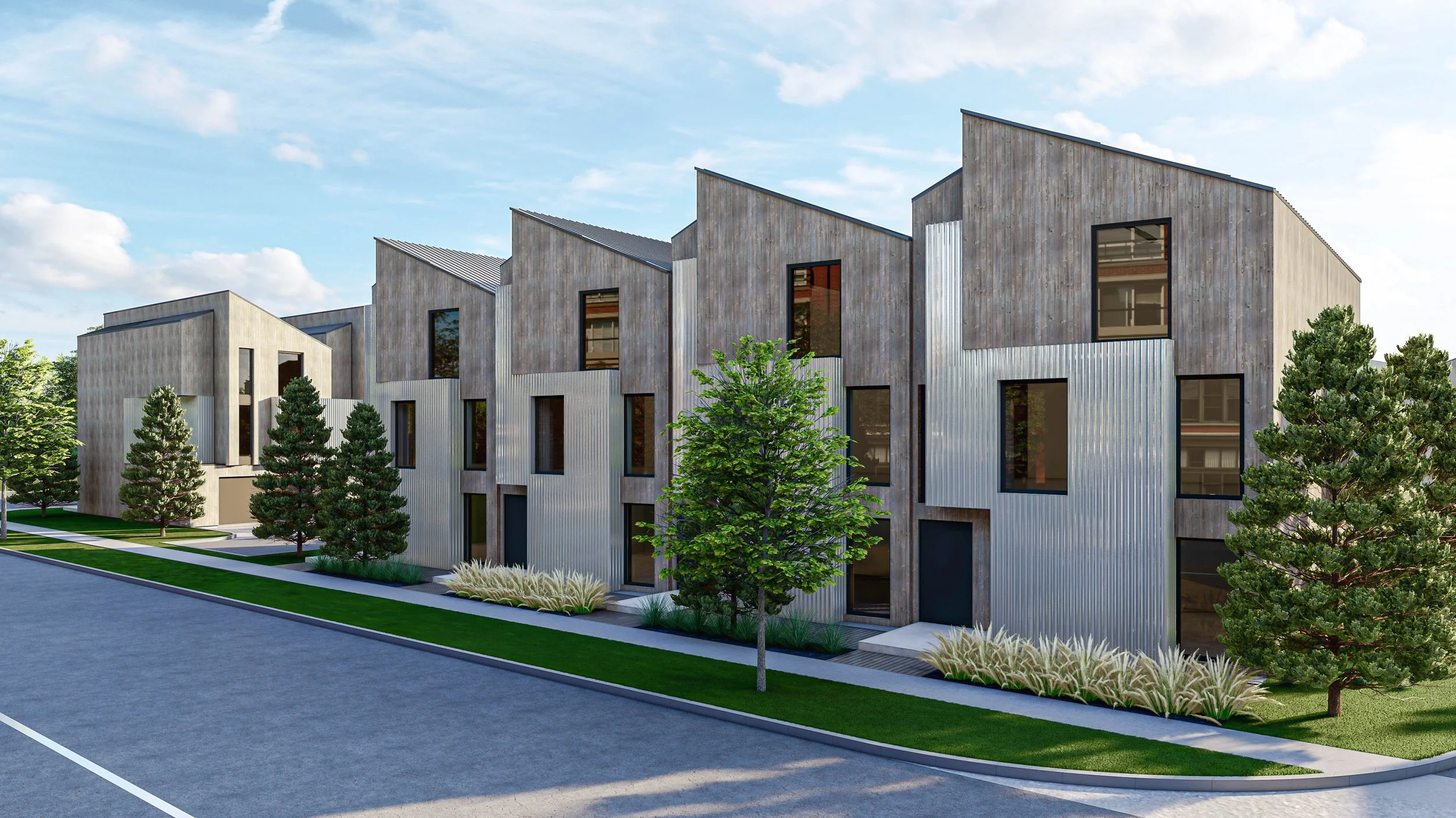 Façades combine vertical wood cladding with corrugated metal panels, creating tactile contrast that feels contemporary yet grounded. Generous, strategically placed windows invite natural light into the interiors while preserving a balanced minimalist aesthetic. Angled rooflines introduce subtle dynamism, giving each structure a distinct profile within a harmonious whole.