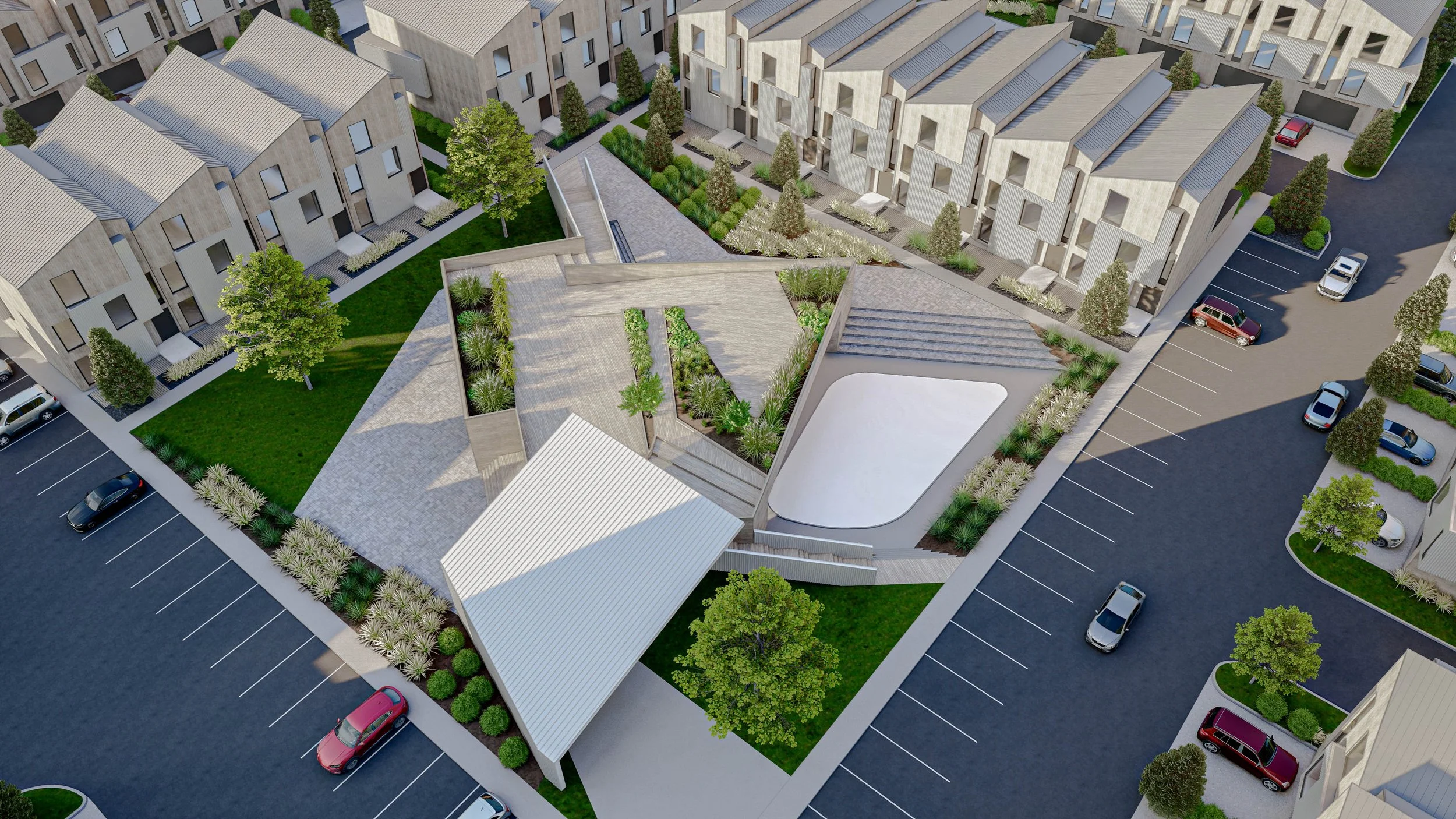 The site is organized around a central green and shared amenity space that fosters community while preserving residential privacy. Buildings cluster to frame landscaped courtyards and pedestrian paths, softened by trees and ornamental grasses. Parking is thoughtfully integrated along the perimeter and in discreet courts, keeping architecture and open space as the visual focus.